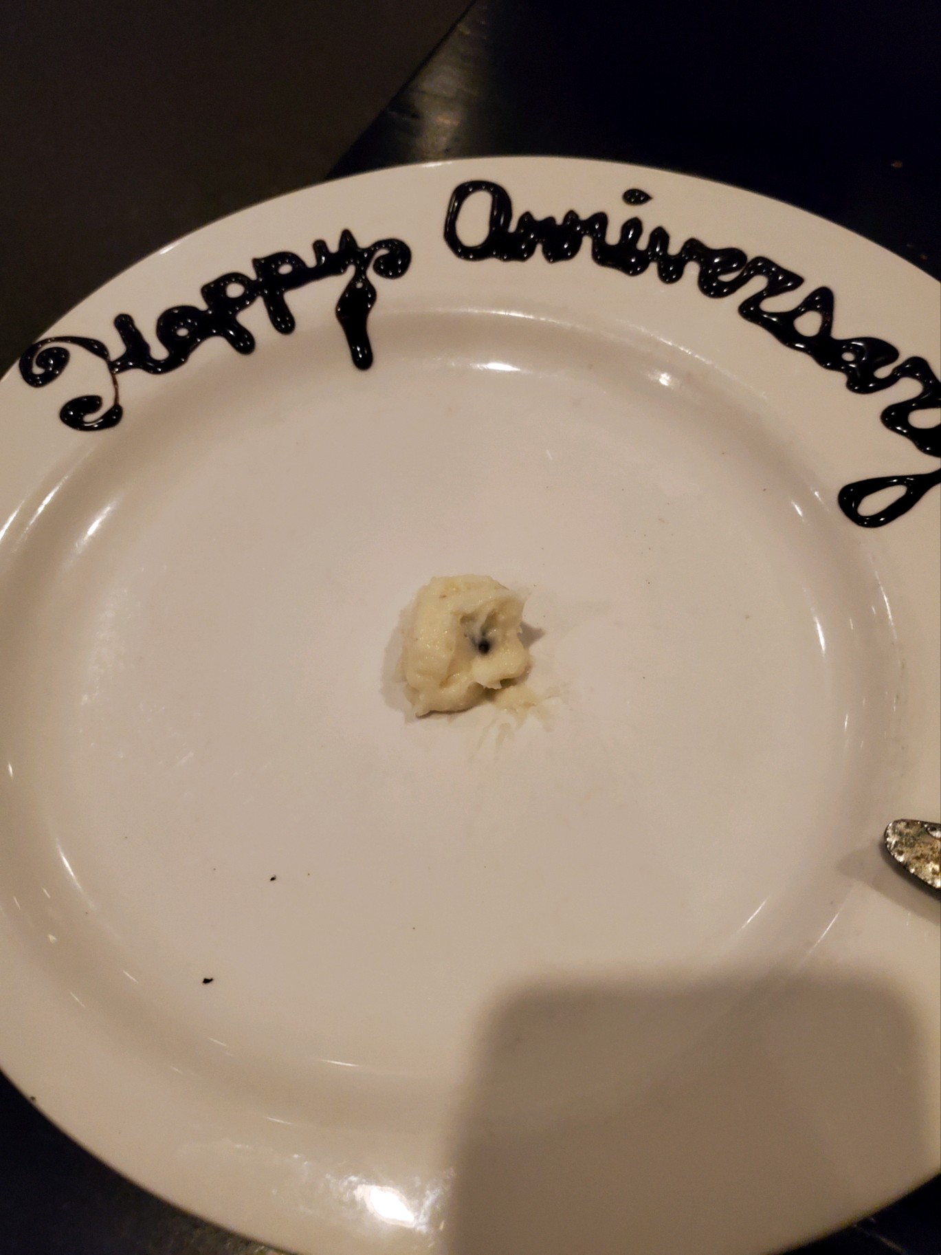 But the real kicker was this photo. It was our anniversary and they knew bc open table asks if it's a special occasion. And the waitress brings this plate out and says "since you didn't order dessert we put together this special plate for you." This plate was literally a spoonful of cannoli filling with "Happy Anniversary" written in chocolate syrup. I was annoyed and embarrassed. I didn't not expect the restaurant to do anything for our anniversary but if you're going to do something, don't do this! I mean, put an actual cannoli on the plate at least. It was the last straw on a terrible meal all around. Needless to say I'll never go back, but hope others that read this can avoid wasting $100+ on a truly...