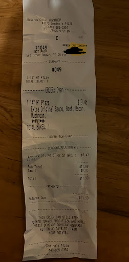Read moreDO NOT ORDER FROM THIS DOMINO'S. I ordered for delivery at 8:21 pm at which time the tracker said Stefani was preparing it. At 9:16 pm, almost an hour later, the tracker said it was going in the oven. At 9:23 it said it was being checked for quality. Done in 7 minutes? That was the end. It never moved on to delivery. I called after an hour and a half, and the woman very rudely told me there were 20 orders ahead of me, and 2 drivers. Three hours later, NOTHING was delivered. Every time I called they'd pick up the phone and hang up. Today, 9/1/25, I tried calling all morning to speak to a manager. Same thing. Somebody kept hanging up. I called my bank, and discovered Domino's had not only taken my order amount, but an additional $35. I reported it to corporate. They sent me a 50% off coupon. I don't want a coupon. I want my $72.00 back! They took $72 for a $37 order that was NEVER DELIVERED. I called several more times today, and finally got a manager. He said the night manager probably cancelled my order, and he hung up. Typical Domino's customer service. Shouldn't she have notified me? Why did she take double money for no food? If she did they're making me wait two days to get it back. I've never had good service or food from any Domino's. The Domino's on the West side of Cleveland has another rude manager. I highly recommend that no one orders anything from any Dominos. Lousy management, and horrible customer...