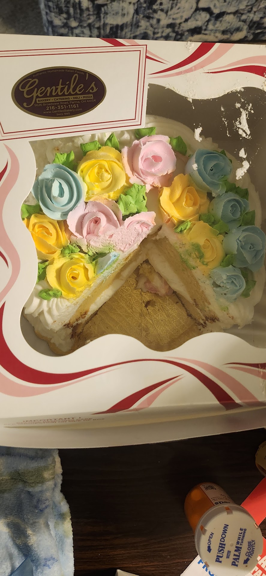 Ā Ā Ā Read moreExtremely disappointed in what I received for my birthday. We ordered a butter cream iced cake and it was not all butter cream, the flowers were not the same. I've ordered from here many times before and this was nothing like previous cakes over the years. I always have them decorate the top of the cake with extra flowers since everyone loves flowers and I don't like to share on my birthday. I have other pictures from other years where the cake was perfect and the flowers were butter cream. The flowers were a whipped topping not the same as the white icing on the cake. I took a big bite out of the flower and was immediately disappointed because I hate the whipped cream tasting icing that is nothing like real butter cream. Gentile's has never done this before. The picture you see is of the cake today(one day after my birthday), still nearly complete because no one in my house ate any more than the 2 pieces that were cut because we hate the whipped cream tasting icing, that's nothing like butter cream. I'm very disappointed, It was my birthday and I paid for butter cream. I've had cakes before from here same request and everything was butter cream. It's horrible that I couldn't enjoy the birthday cake I paid for because it wasn't right. This was not what I was expecting from Gentile's, I will not...