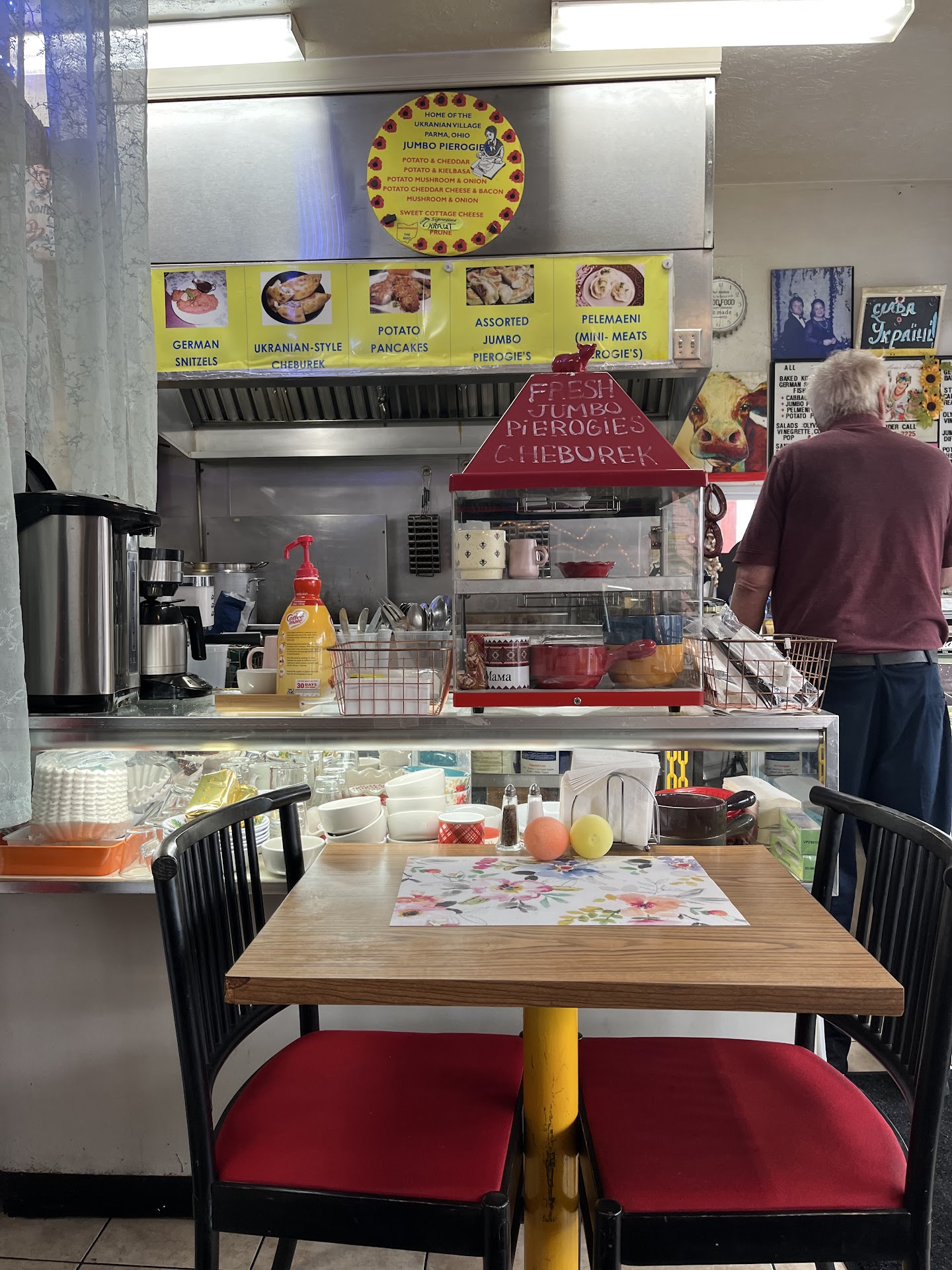 Authentic, authentic, authentic! This small, but not to be missed, restaurant is truly a Cleveland gem and nod to our continued ethnic heritage. The owners arecthe same as the butcher shop next door, so you know everything is fresh. The place is small (3 booths), but I felt as if I was sitting in a friend's kitchen. The staff talking in their native language, a Ukranian (?) Radio station on, the knickknacks all over the room. I loved it! As it was my first time, I wanted to try as many things as possible. Not a problem! The ladies took the time to describe everything, made up smaller plates, and even cooked items fresh. Everything was delicious; potato pancakes, Ukrainian cabbage salad, stuffed cabbage, cabbage and noodles, sauerkraut and sausage, and a meat pie (cheboureki ?). I got so full that I forgot about the pierogies. I guess I'll have...