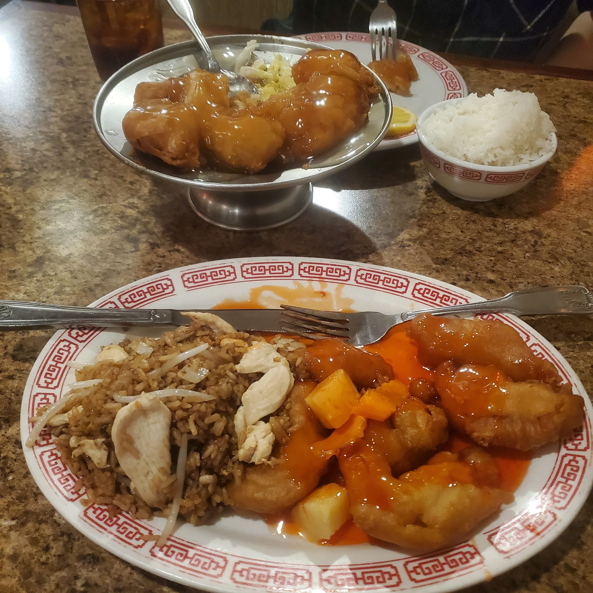 Got the house fried rice that was suppose to have 3 different meats 😂. What a joke. I ordered a large and probably had 3 shrimp, 6 slivers of chicken, and tiny diced ham.