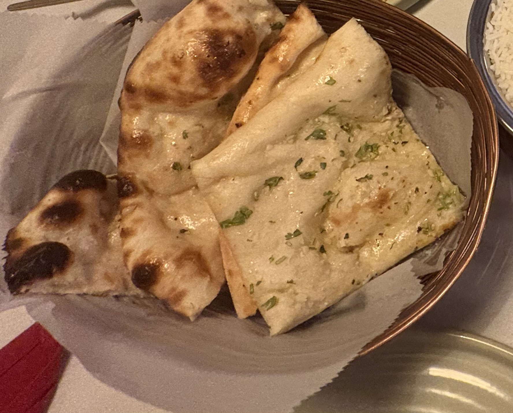 My wife and I went into Masala Monsoon after we saw that it was finally opened for business - we drove by the former Antonio’s location seeing the “Opening Soon” signs and couldn’t wait to try it out. We were not disappointed; we were greeted by a friendly face after entering, asked what style table we preferred (high-top or standard), seated & given our menus. The choices are all well presented on the menu and easy to read. We made several choices to try to get different tastes.