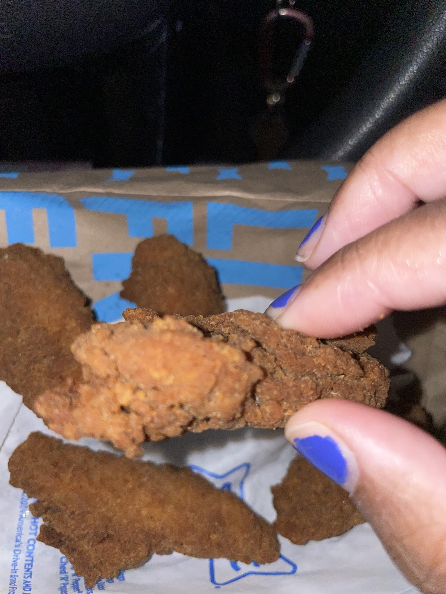 I ordered 5pc tenders and cherry lime aid. The tenders were piping hot so that let me know he just made which explains the long wait time. I’ve been here 30 extra minutes now mind you. My order was a pickup so it should’ve already been made ready to go. The tenders were small and not as advertised. They smelled like old grease which adds up cause they are getting ready to close so this grease has been cooked in all day I would bet on.