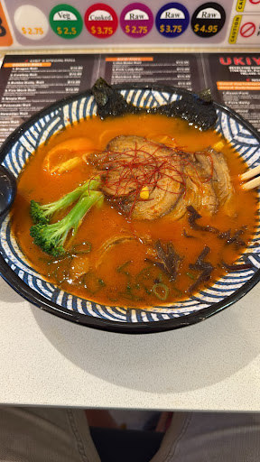 Upon my arrival, there were several people in there. There wasn’t too much sushi variety on the belt, but I assume this is mainly because they don’t want to waste food if they’re not a lot of people coming in over a period of time and suggest that you order from the menu instead. Of course I’m going because I like the idea of the revolving sushi. Anyways, I also had the spicy tonkatsu pork ramen it was good, but I’ve had better. I wasn’t expecting top quality.
