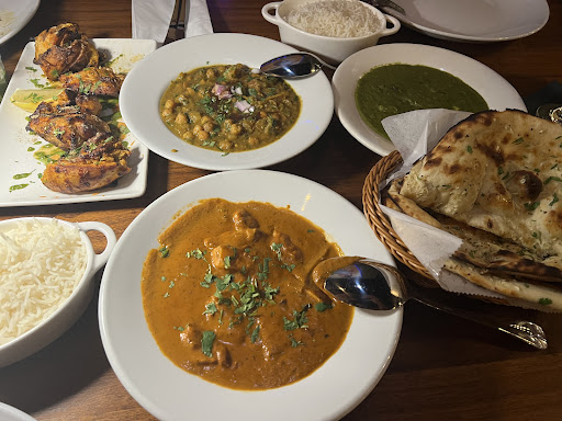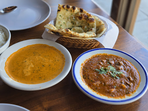 We got the classic Chicken Tikka Masala, Lamb Vindaloo, Garlic Naan, and Basmati rice, as well as Mango Laasi.