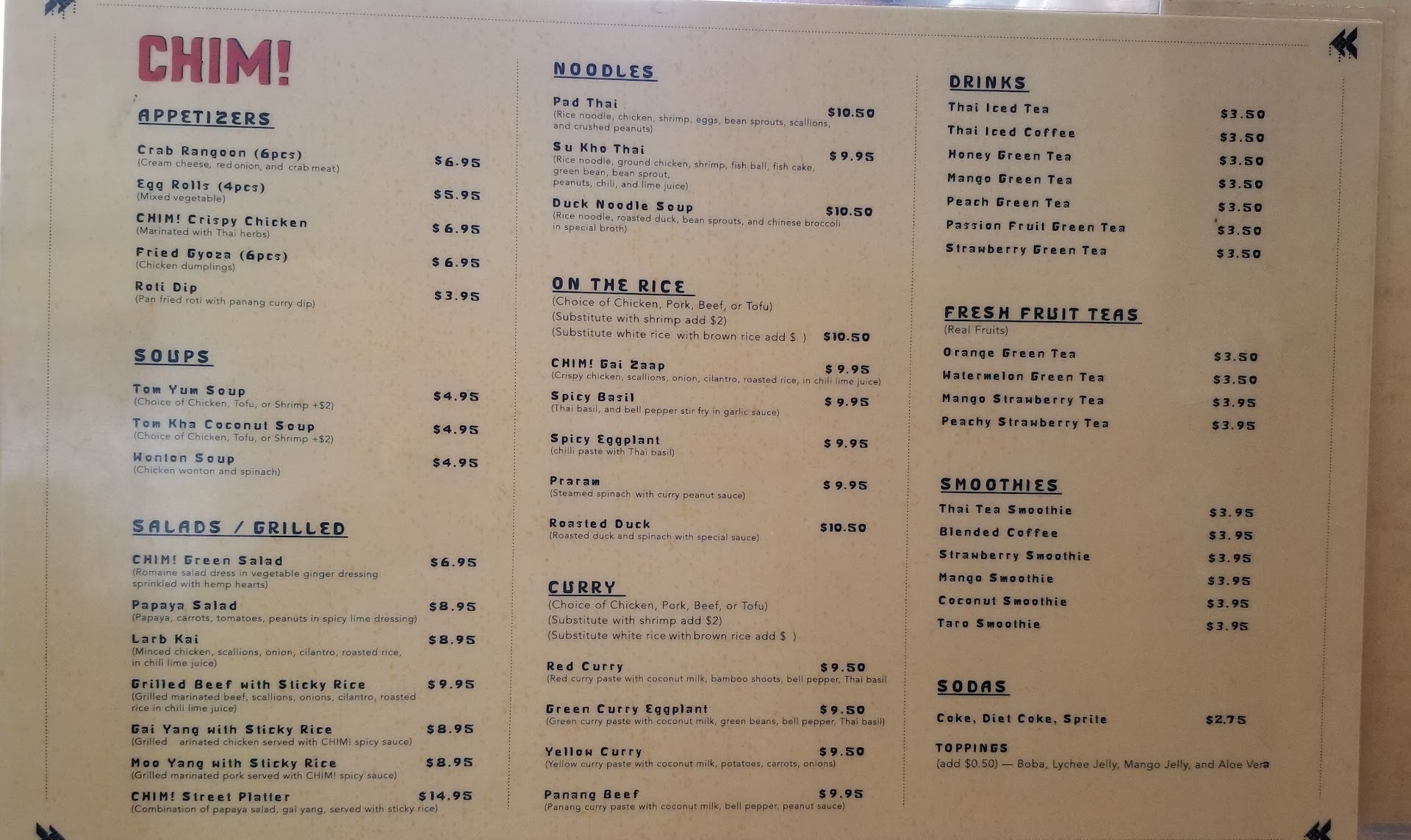 We ordered the Chim fried chicken, Roti dip, pad see ew, beef with sticky rice, beef Panang and Thai tea. We forgot to ask to make the dishes mild specially the Panang. We found out that it is made in batch so it is already spicy. The beef with sticky rice can be ordered mild. It is served on a bed of lettuce, basil leaves and red onion with fish sauce vinegarett. The fried chicken is crispy delicious with tangy spicy dipping fish sauce. The roti dip is like a thin quesadilla without the cheese. It comes with a yellow curry dipping sauce the same sauce used for the Panang.