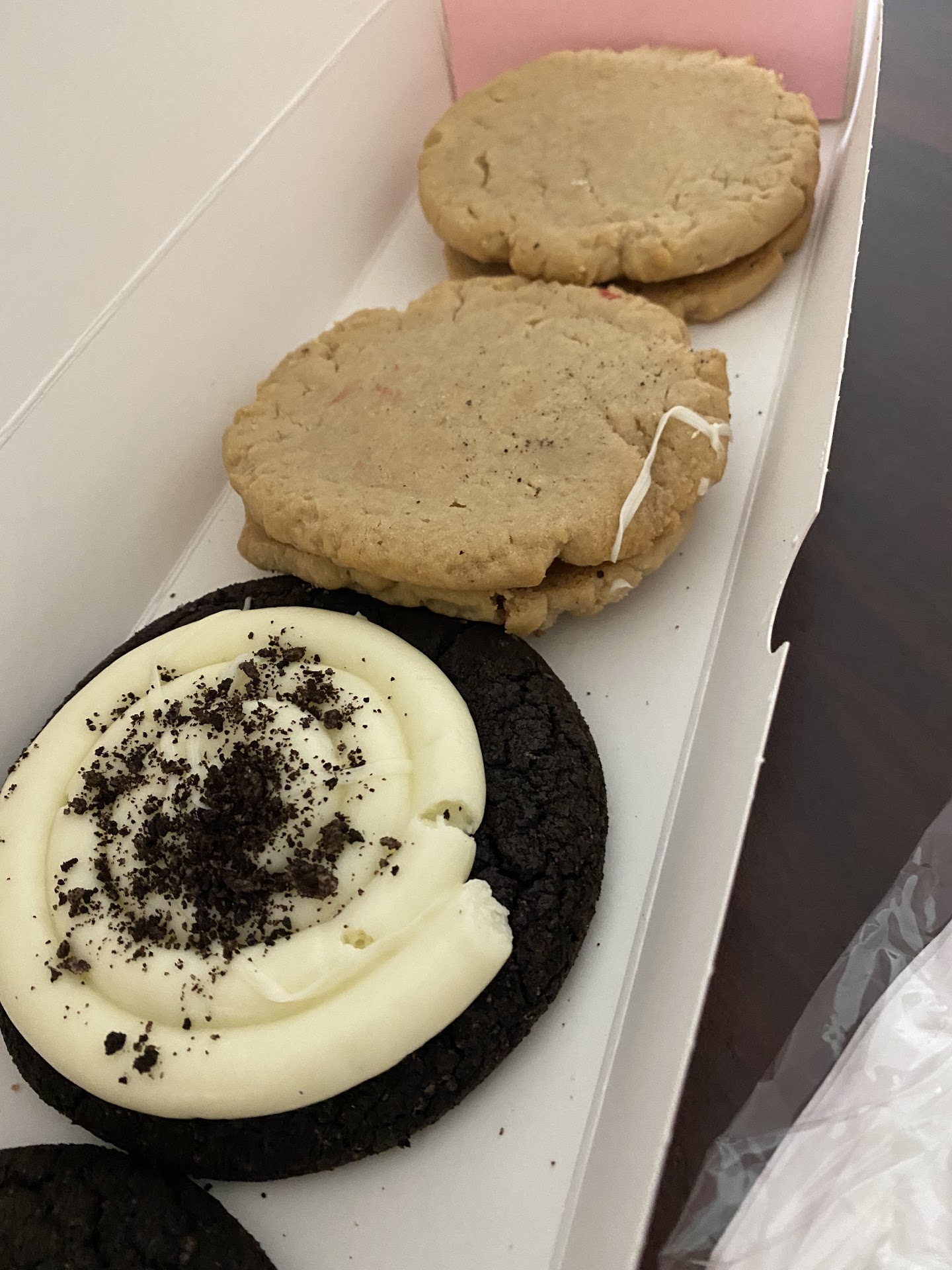 Read moreWish I could give them zero stars. First off, the music was louder than the music at a Hollister. The AC was as if it was off. There was an empty chocolate milk on the counter by the employee working the register, as if that was his drink he was drinking. Plus he seemed rude and felt rushed. To top it off, I'm watching one employee finishing off the cookies and boxing them up, giving the boxes to the customers inside and running them out as well for curbside. They had been touching the main door, it was covered in smudges from the grease and frosting from their gloves, and after delivering the cookies outside, she ran back inside to get more cookies boxed up. Not once switching her gloves! That is completely disgusting and I had asked them kindly and quietly if they could switch gloves and remake my cookies. Because those cookies are expensive and I rather eat them then toss them. I get their busy, but it's not excuse to skip out of being sanitary. I highly suggest the store gets a runner. One that runs the made orders out for curbside and just in general gets the boxed finished cookies to the customers, so the ones decorating the cookies can keep their gloves clean and not be touching the main door, customers hands, and such like so.