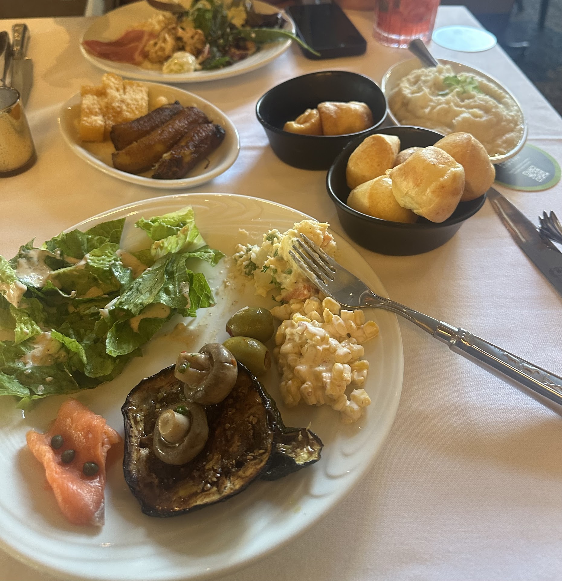 Food their market table is definitely lacking compared to other locations. There were also times when some selections ran out like papaya, tomatoes, etc. but there are whole fruits and veggies on display. Only after requests from guests did they cut those exact same displays. Also they prepared some of the items right on the salad bar counter, cutting tomatoes etc. right then and there. Not saying it's bad but it's the first time i saw that kind of exhibition. I expected everything to be prepped in the kitchen where it is more convenient for everyone specially the guests. There were times when the lines in the bar was a bit long. we asked for a speific meat numerous times which was in their menu and we were informed it is available and will be brought out to our table but never came. Then when we asked a different crew, he said it is actually not available. The 1st person we asked about it did not come back to tell us it was actually not available, had we not inquired again we might have paced our dinner more pointlessly to make room for something not coming at all. had to ask for their cheese bread, not sure if its by request for this location because they didn't serve it until we asked. we had to watch out for crews bringing out meats because sometimes they miss offering to all tables even if they still had plenty to offer. We spent almost half of our time eating salads and appetizers from the market table. they seem to have more chicken coming out than other meats. Or maybe that was just the kind that were offered to us most of the time. most of the meats were overcooked, hard and dry.