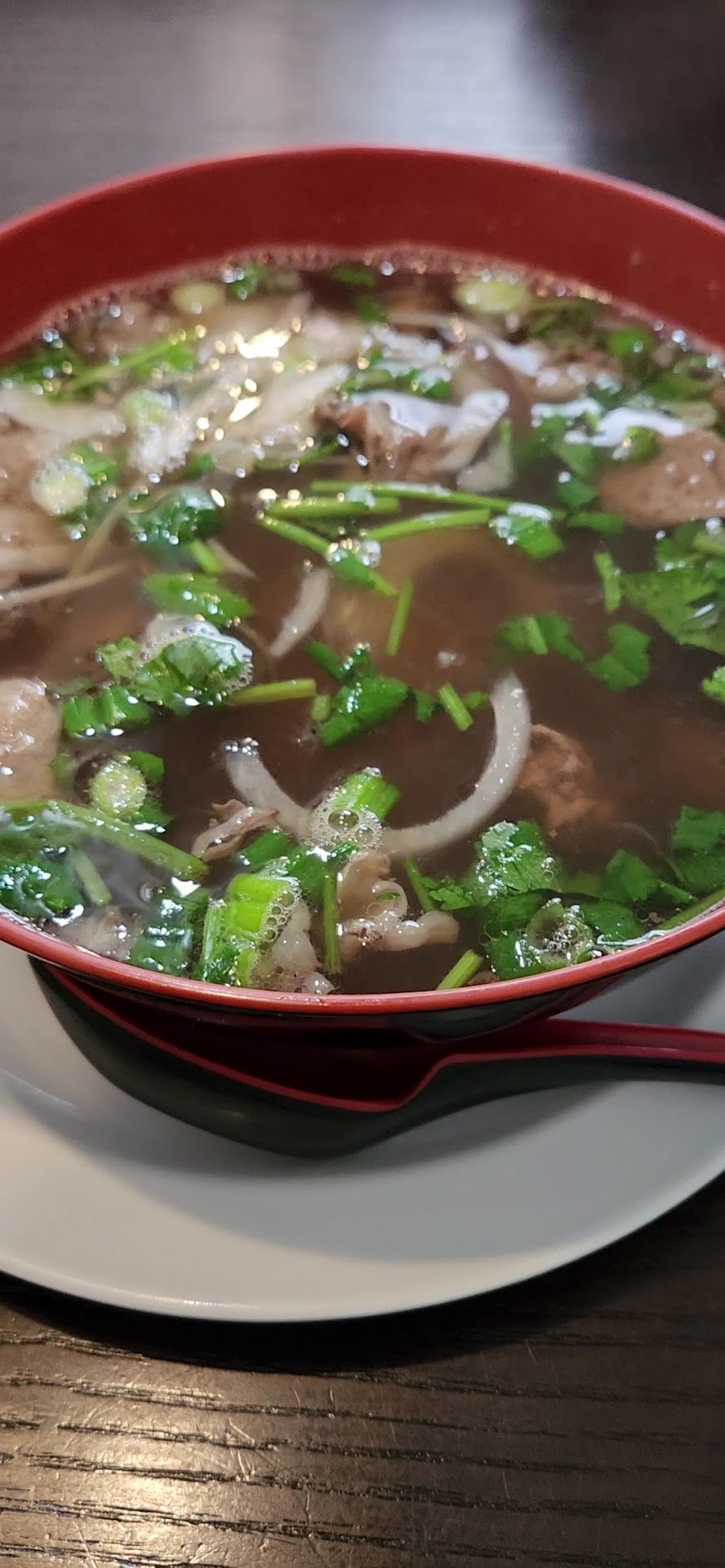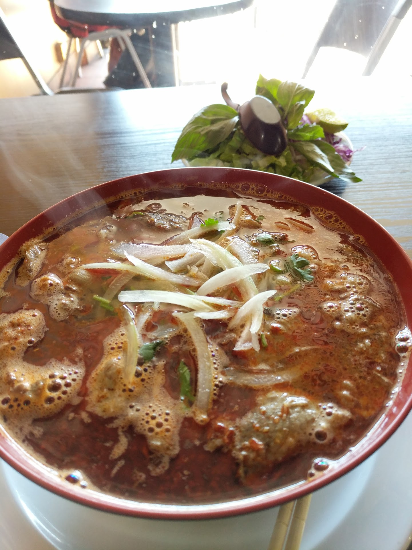 I branched out from my usual Vietnamese order and got the bun bo hue (spicy lemongrass broth with beef.) It was perfect. A little bit of tang, moderate amount of heat, and hearty flavor. Good meat portion, wish they had meatballs too.