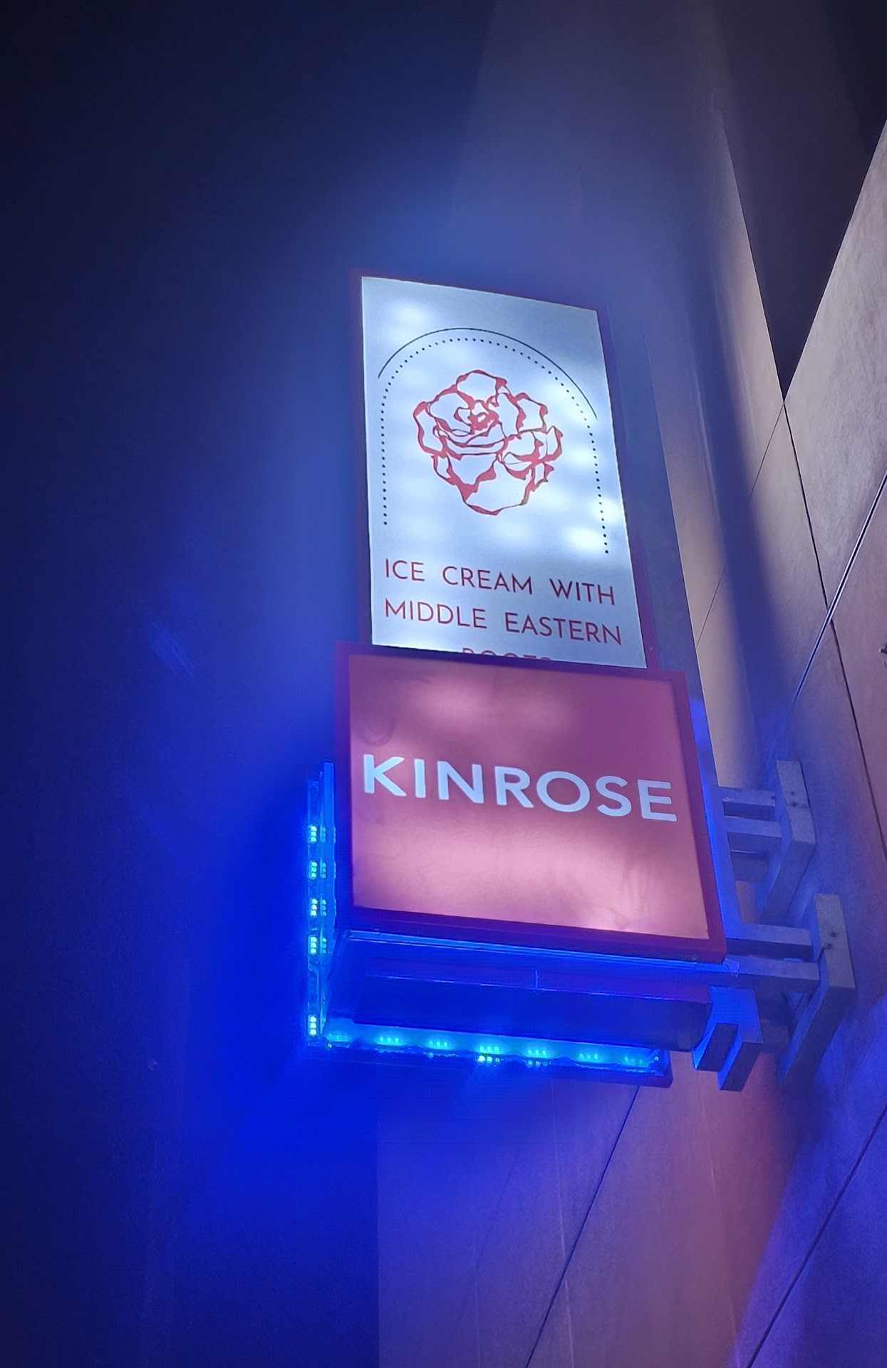 Ahhhhhhmazing!!! Must visit! We visited Kinrose Creamery on a fall Friday night, and were drawn in by the jazzy duet playing live music on the patio. Upon entering, we were met with a warm atmosphere of patrons of all backgrounds vibing together, waiting to try an ice cream flavor. The sign outside says "ice cream with Middle Eastern roots," so we were curious and wanted to give it a try. It's a quaint space that is set up so well with thoughtful new age decor. The chairs are unique and remind me of the Jetsons. There's a cool comfy couch at the front window, PacMan and Ms. Pac Man, cacti, and some cool cartoon framed art on the wall that you can scope out while you wait to order. We were here for 35 minutes from entry to exit. There were about 10 people in line in front of us, but the line moved quickly. We sampled a few flavors and settled on Sour Cherry with Fairy Floss, Saffron Pistachio Rose, and Walnut Baklava.