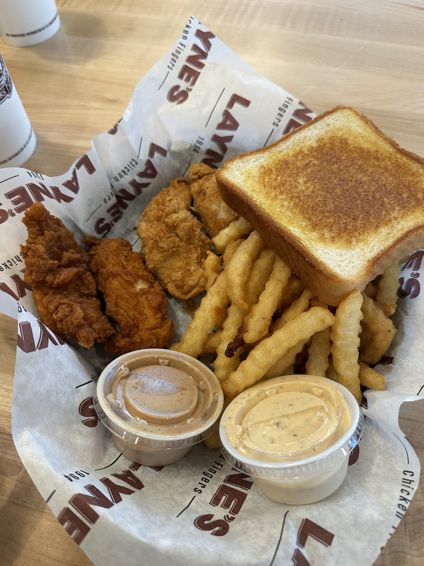 Read moreI typically don't write reviews...but this place was shockingly bad for how it is advertised. Layne's is known best for being the first in the "chicken finger" game, beating Cain's by something like a full year or more...however, in literally every possible respect, Cain's is a better choice, whether you are comparing price points or quality or service. My visit was drive-thru, so I cannot speak so much to the interior cleanliness/atmosphere...but the take-out line we were in was far slower than any other fast food restaurant around...even Sonic is faster than this was. Upon arriving at the window to pay for my order, the young lady who was operating that station gave me no greeting, no confirmation of my order, and definitely nothing approaching a pleasant demeanor...simply a flat statement of my order's price. The chicken fingers were tiny, chewy, and either burnt or overdone to the point of resembling dog treats. The sauce, while generic and plain, was dried to the lid of the small container, indicating storage in a cold environment for extended periods. The optional ranch sauce was little more than an opaque white water with the occasional peppercorn flake. The "meal" comes with a single piece of "texas toast" which was stale, cold, and prepared without every having known what butter or oil even looks like. The fries were indistinguishable from Ore-Ida's crinkle cut fries, and were cold, limp, totally unseasoned, and the portion was what one would expect in a kid's meal. There was no option for cole slaw (or any other side). In short, Layne's needs a lot of work to come close to approaching the quality or class of the other chicken...