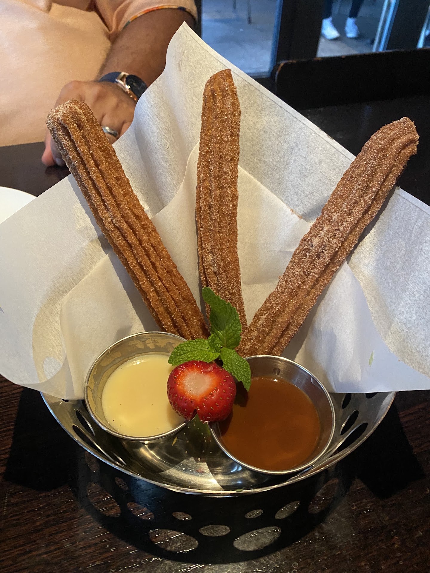 Dining at Maestros is a hit and miss. Before Covid, it was a much larger menu with more eclectic choices. Now the menu is much smaller, and obviously the prices have increased. The meals that my husband and I ate tonight were delicious. We indulged in the Carnitas and the special of the evening which was sea scallops. The only thing that went wrong with my meal was “woody” asparagus ends, but everything else about the meal was great. Our waiter was lovely, very helpful and conscientious. Then came the dessert. We were convinced that with our waiter’s enthusiastic suggestion of churros we had found the perfect ending to our meals. Sadly, we were mistaken. What showed up was a delicious looking dessert albeit very dark looking churros than what are used to. It made me a bit nervous to be handed a large steak knife for a dessert but you sprinkle cinnamon, and sugar on anything and I’ll try it. However, upon enthusiastically cutting into the churro I found it to be extremely gummy with uncooked batter in the center surrounded by some of the dough that was cooked. This obviously means that the oil was too hot and therefore, cooked the outside of the churro faster than the inside of the churro. My husband called the waiter over and I mentioned it. He said he’d be back. Instead, he sent the manager over who tried to convince me that that’s how the restaurant cooks churros, that most people don’t cook churros correctly and that’s how churros are supposed to be cooked: Crunchy on the outside with gummy (uncooked) batter on the inside. I mentioned that uncooked batter has raw egg in it and then she continued to tell me that she could guarantee me that there was no raw egg in the churros. They were perfectly safe. I don’t know about you, but I’m not eating anything that has egg in it that isn’t completely cooked. She told me that’s how the restaurant does it and that she would remove it from our bill if we didn’t want it re-cooked, which would make it much harder and dry inside. So we had it removed from our bill. Now I’m not stupid and I know that churros are not supposed to be uncooked on the inside at all so much so that I’ve contacted two pastry chef friends of mine after dinner to confirm whether churros were supposed to be gummy on the inside. They said both told me absolutely not. If there’s gummy, sticky dough on the inside of a churro, it means the oil was too hot, which is what I assumed. Churros should be light and fluffy on the inside and a bit chewy with a crunchy exterior. I’m just posting this review as a warning in case anybody decides to order churros at this restaurant. If you enjoy this type of dessert, it’s your tummy not mine...