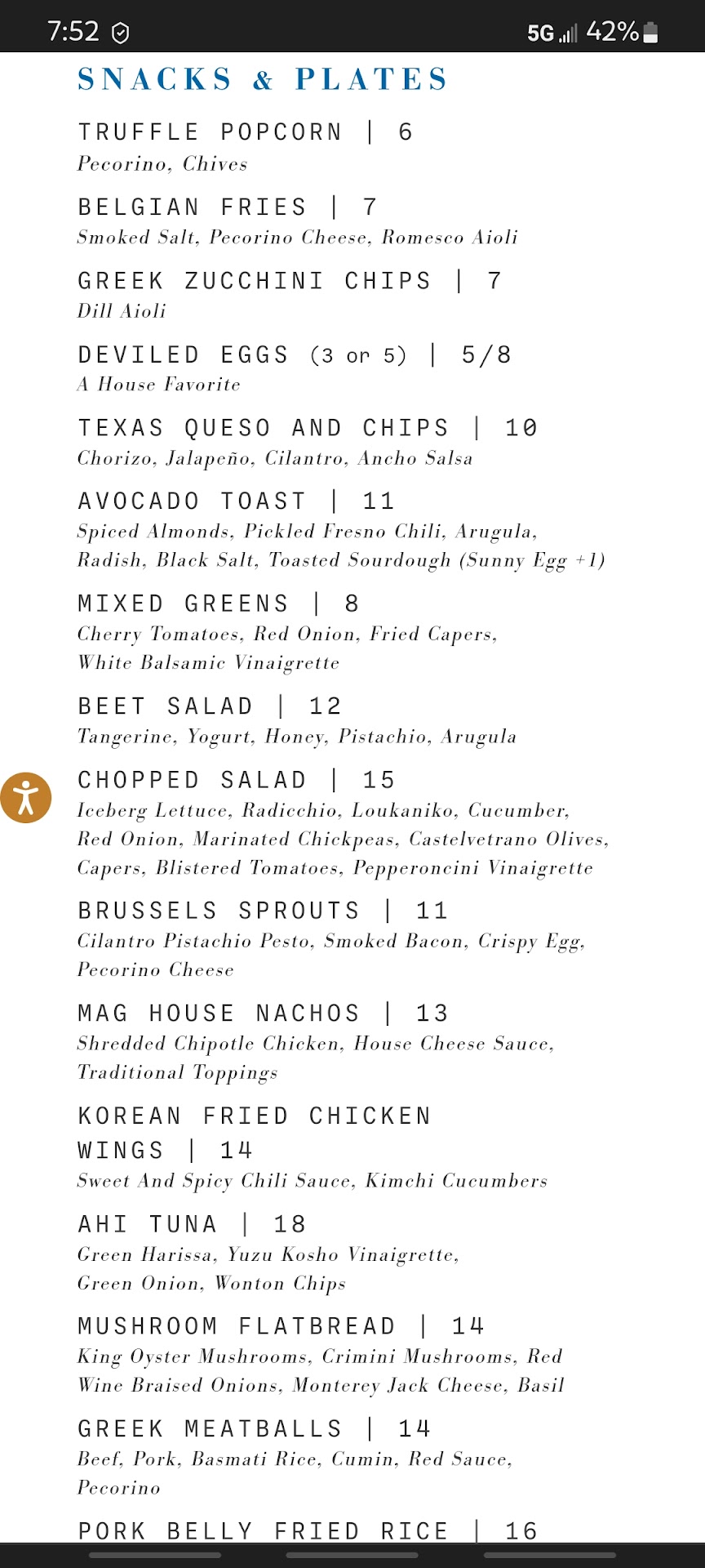 Read moreThe atmosphere is nice. The seating is a bit different. We waited over a half an hour before our waiter came to the table. We had to flag down two different servers for drinks and appetizers. We had to keep asking for water and service multiple times. If I could I would leave zero stars for service. We had the crap cakes, they were okay. The waiter came to take our plates and asked us to take our dirty silverware and place it on the table. there was no plate to put it on. Server take the plate with the dirty silverware and bring new silverware. I asked my burger to be medium rare and it came back very well. Tasted like shoe leather. Should have sent it back but just couldn’t get out there fast enough. Would never recommend this place for lunch or dinner. The menu is very limited for meals. Maybe for drinks and small plates. Maybe it was an off night. We are very generous tippers leaving OVER 25 % when the service is good but felt forced to give the small % we did give. I was surprised to see the high ratings maybe it was an off night with service...
