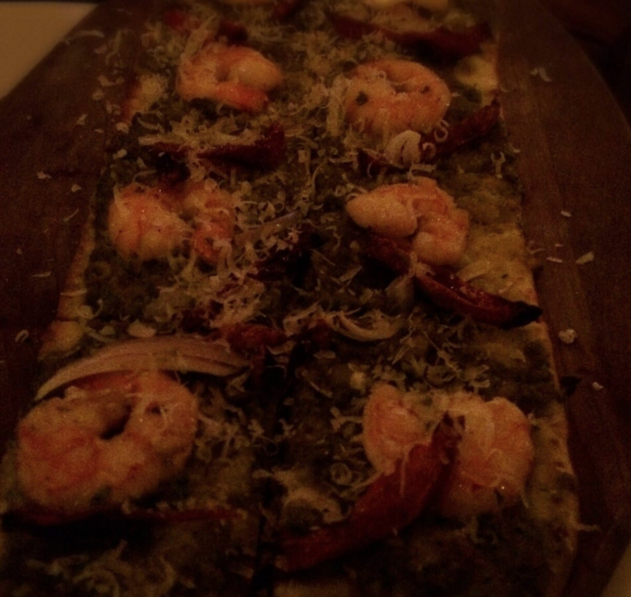 Food We got the Beer Queso and Chips. It has horseradish, roasted red pepper, ancho tomato salsa and cotija cheese. I never had this before, it was different but I liked it. Next is the House Burger which consists of American cheese, thick cut smoked bacon, bourbon onions, and dill pickle. The bun was soggy but everything else was good. Then we got their special, it was Shrimp and Pesto on a flatbread. The shrimp tasted fresh and it had the right amount of pesto. If you want something spicy, get the following dishes. Gus' s Fried Chicken Sandwich, it has jalapeno, sesame ginger aioli, and herb cabbage slaw. The Korean Fried Chicken Wings was sweet and spicy. It was served on a wooden board with a side of kimichi cucumbers. I liked the tangy flavor of the kimichi cucumbers. The chicken wings were crisp and flavorful. We enjoyed all the food even if some of the items we ordered was too hot for our taste bud. I love the ambiance especially the open patio area.