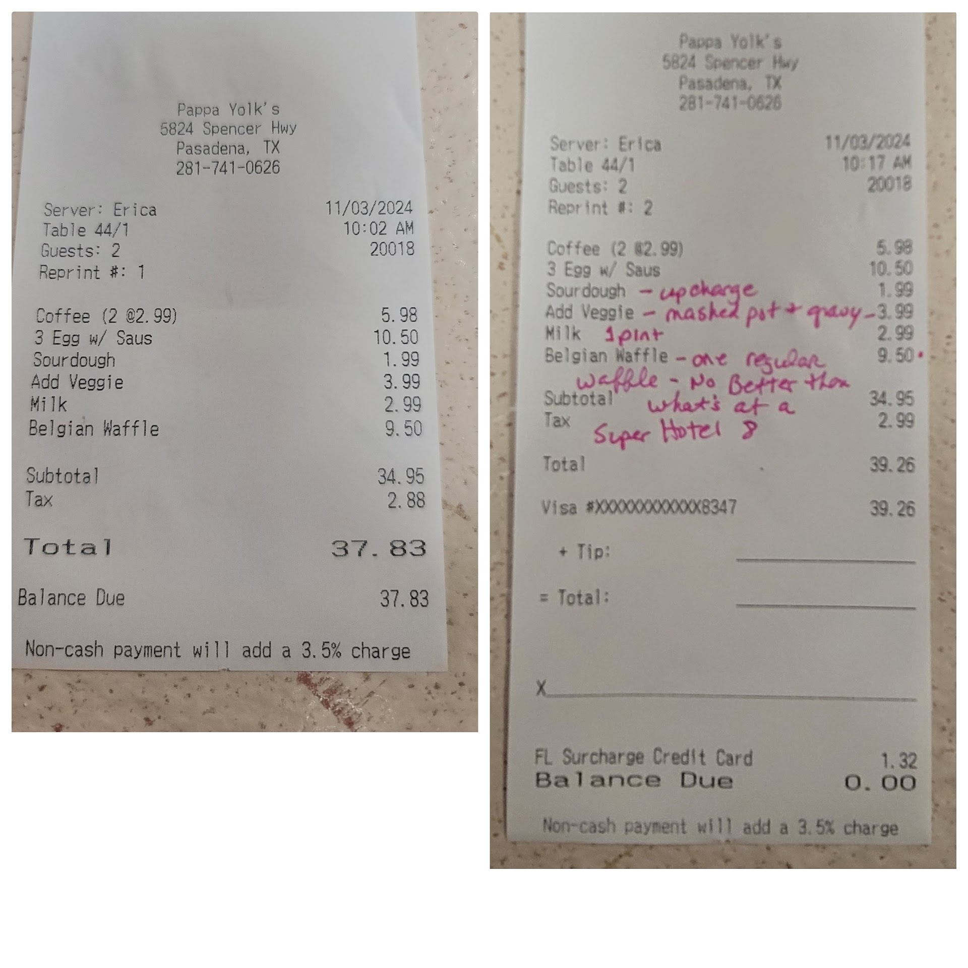 I also went into the restaurant a week or so ago and not only was my boss's order wrong (they comped it), but my waffles had pecan SHELLS in them, and I didn't finish my meal for fear of breaking a tooth. No one offered to correct the issue.