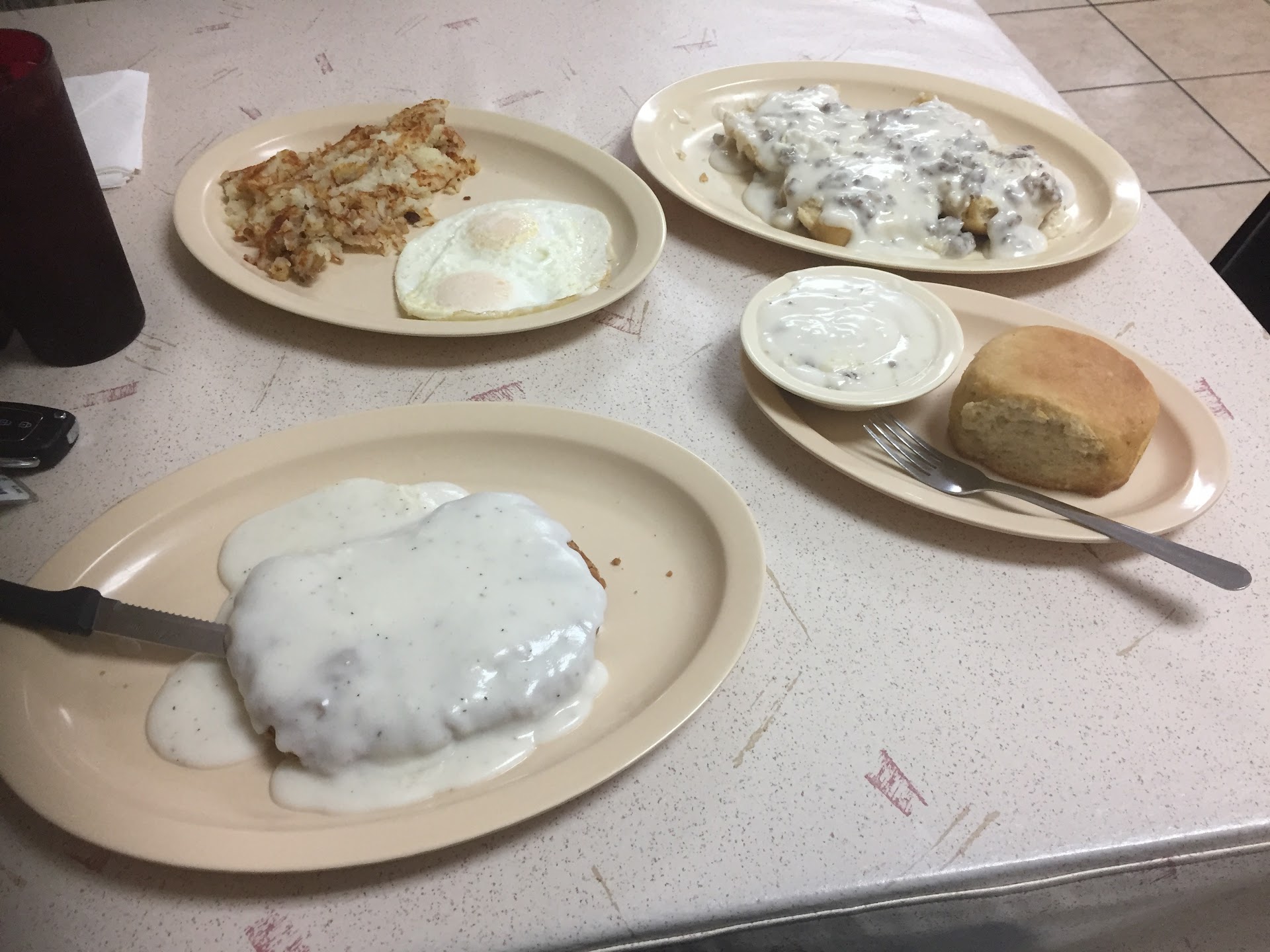 My omelette was just a giant lump of tasteless eggs, my biscuits and gravy were flat dough cakes with no flavor, the gravy was white Elmer's glue, the grits were... lumpy sandy water at best. How do you mess up classic southern standards so bad? The iced water was delicious, but not worth the 35 dollar bill. They seem to go for the 'wow' factor of large size and portions, but I'd take portions half the size if they had some taste to them. We left with most of our food uneaten, and went to another place to eat. Management never came to speak to us about the food,...