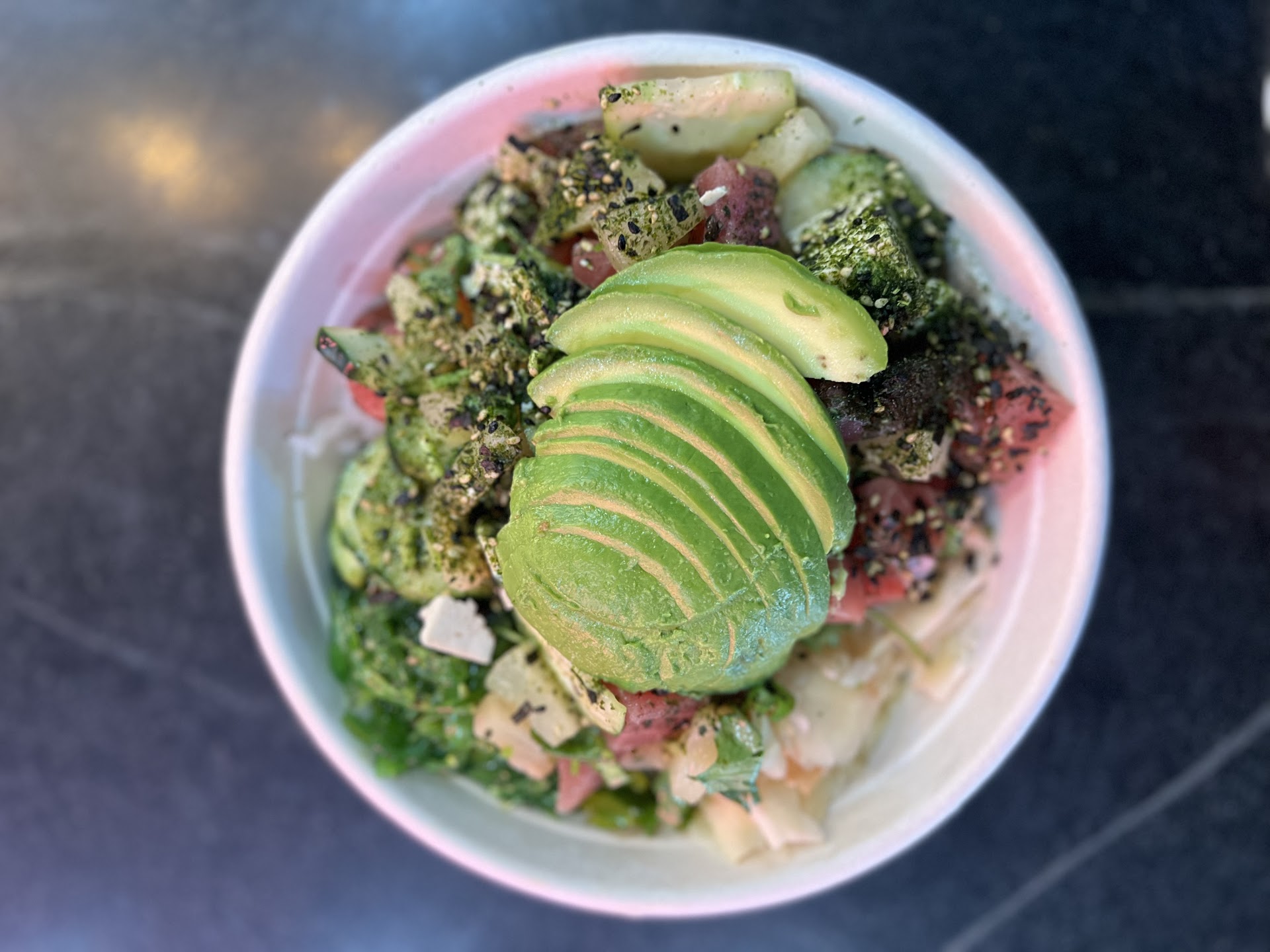 I ordered: Large bowl, white rice, cucumber, cilantro, extra pineapple, and seaweed salad, ahi as well as tofu&avocado, yuzu ponzu, ginger, and furikake. It was $17.99.