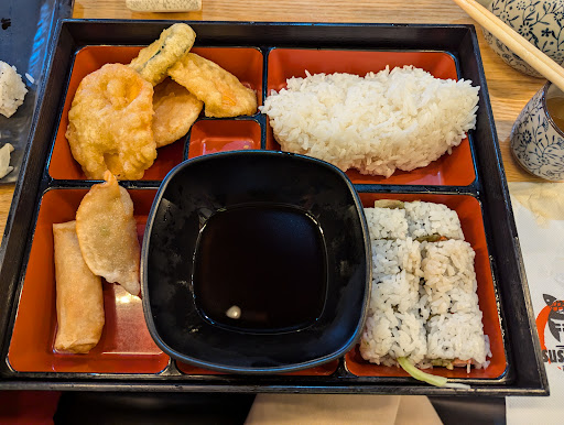 Everyone else's food arrives and still no bento so I asked and he looks confused but says he'll take a look. Then I see the entire wait staff go up to the front to look at the menu. Eventually when the rest of party was almost done, I finally got my bento. The tempura was decent. The tempura sauce was in a bowl that was too big for the bento tray. The rice looked like it was just scooped from the rice cooker, and I had already finished my fish by that time so it was just white rice. There was a single fried egg roll that tasted a little soggy.