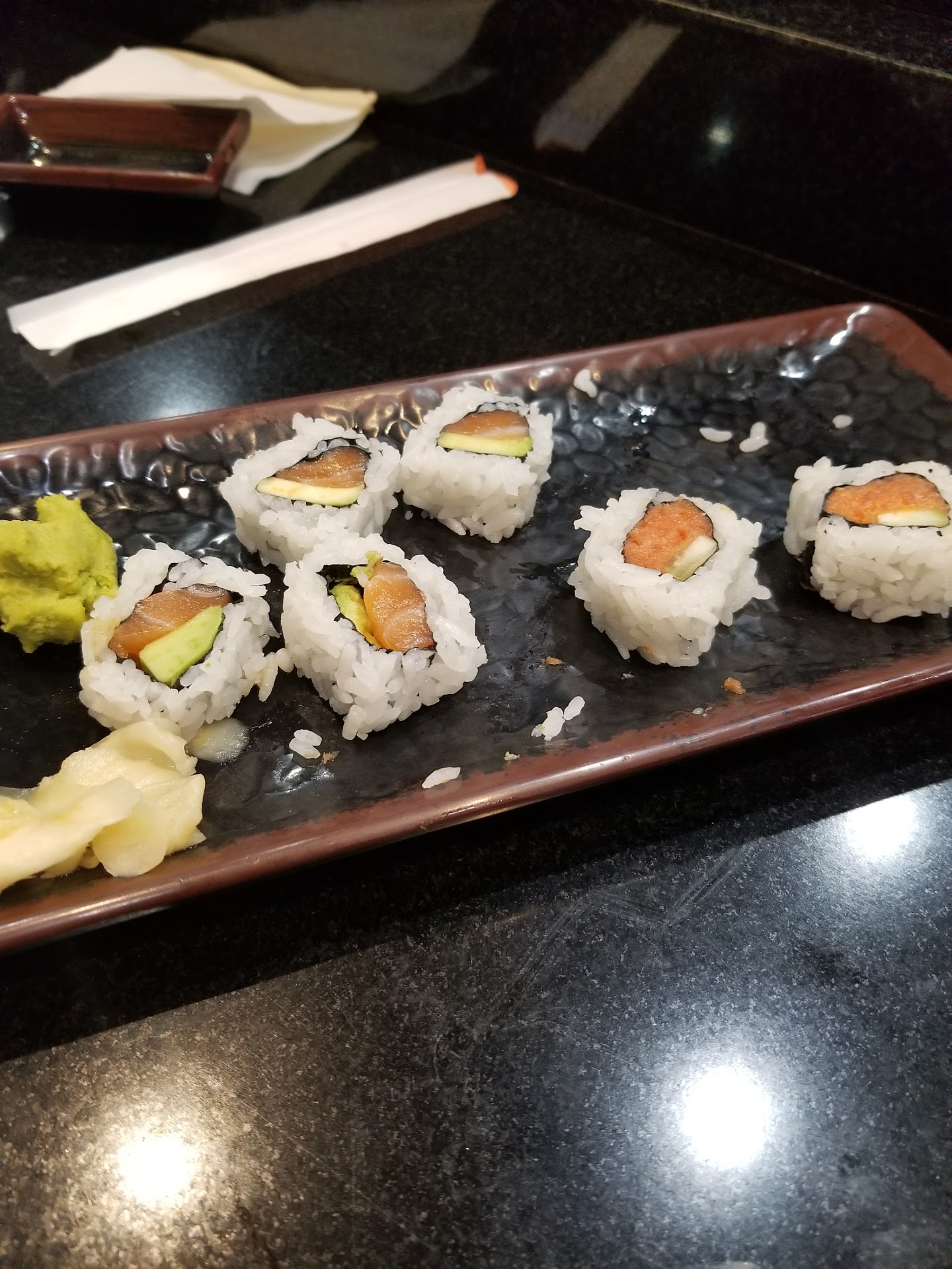 Read moreVery disappointing first time experience and will never go back! After we sat down and placed our order for 6 rolls, the first roll arrived without any wasabi or ginger on the bar. When asked, and the waitress said that the rest of the sushi is almost done and the wasabi n ginger will come with it. One of the rolls had only 4 pieces, 3 of them 5 pieces, and 2 of them have 8 pieces. The more expensive rolls where 4 pieces or 5 pieces and simpler ones were 8 pieces. The rolls were made very small and not enough fish in them. The food was mediocre but the service was bad. At 5 o'clock the place was overstaffed with 9 employees with only 5 tables and most of them were in the back talking to each other laughing and playing on their phones instead of caring for the customers. The sushi bar prep area was covered up by wood making us miss out on the experience of watching the actual fish being prepared and/or observe the cleanness and the freshness of the entire fridge area. The servers were not on top of their game asking us if everything was OK or we needed anything. We had to keep asking for hot water for the tea, the menu to order more sushi, and to...