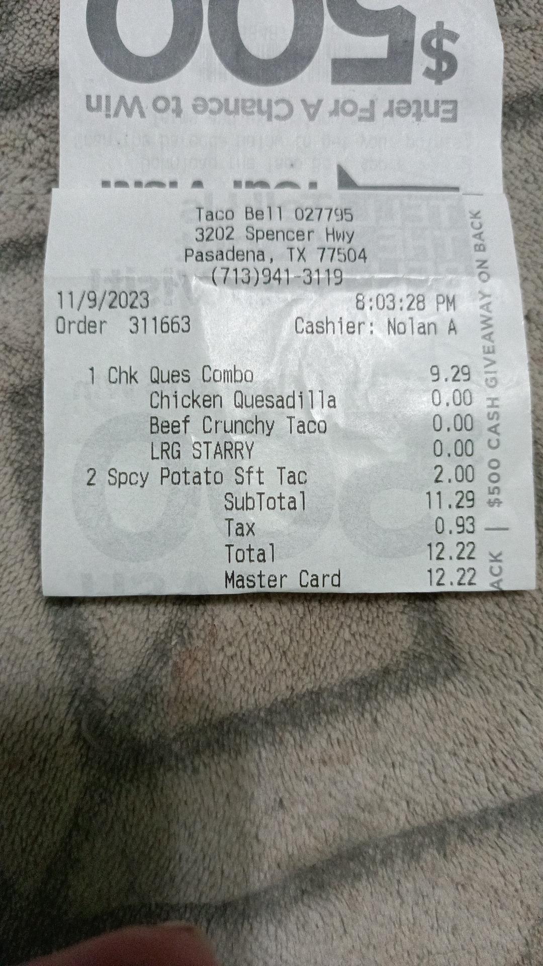 Ā Ā Ā Read moreCame through 30 minutes ago or so at 8:03pm. The cashier (listed on my receipt simply as "Nolan A" was quite simply rude. We pulled up to the speaker in the drive thru, and when I said "give us just a minute please", because it was raining and we needed to look at the menu before ordering, the cashier very audibly and loudly sighed over the drive thru speaker, as if I was wasting their time. After about 1 minute they said "Are you ready to order yet?!"... We finally just picked a few things almost at random as we didn't want to even be there anymore. We got to the window, and the cashier repeated the total of our order. I handed them my card. No other words were spoken to us, the cashier came back to the window, shoved my order into my hands and stood there as if waiting for me to leave. No "Thank you come again", or "here ya go", or "have a nice day", nothing was said period. It was obvious the cashier did not want to be there whatsoever. After getting home with our order it became clear that the Starry drink we ordered with our combo, was out, and we were given basically carbonated water. Worst experience at this location...