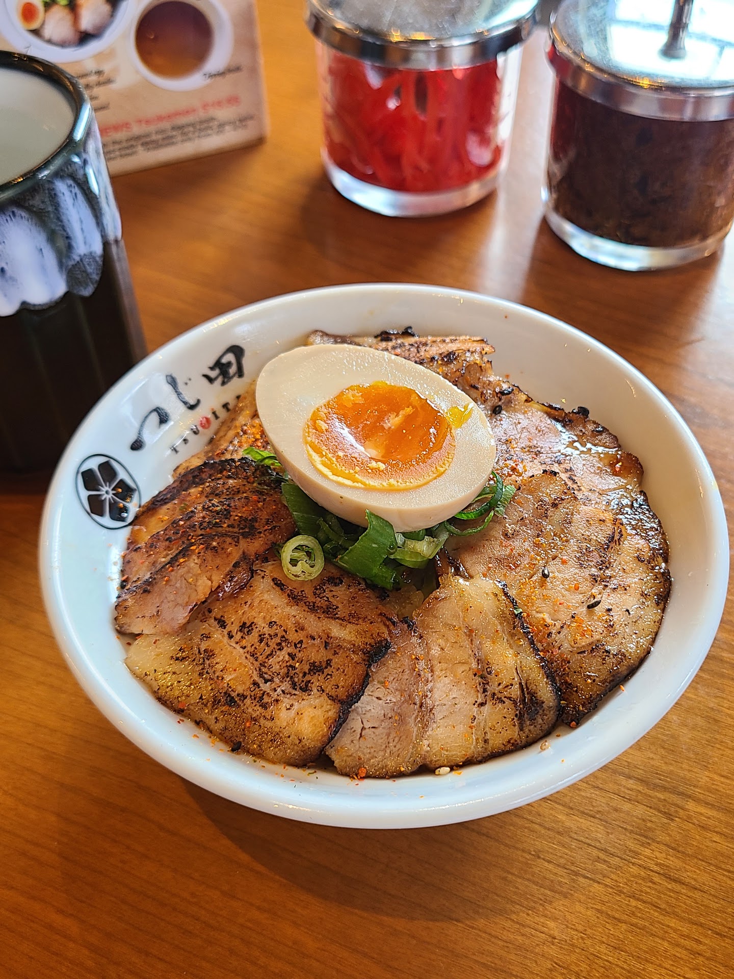To round out the meal, we ordered one of their rice bowls. It was simple and well-executed, with nicely seasoned sliced pork belly and properly cooked rice topped with delicious sauce and a half marinated egg.