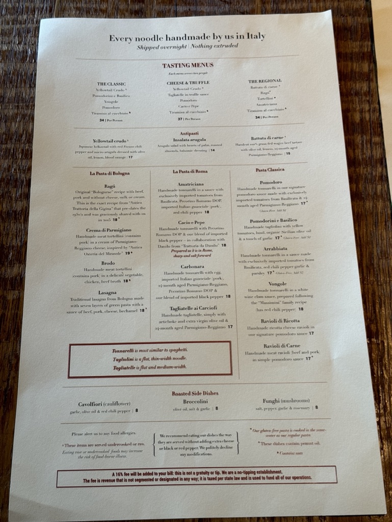 The only thing is that for the price, it feels like you're paying a lot for just pasta noodles, tomato sauce and cheese. I'm accustomed to paying less at local restaurants for pasta with sausage, shrimp, meatballs etc. Granted, it is technically multiple courses and there is an artistry to what they do that might justify the prices. I think some of the flavors could use some adjustment, and this is probably a once in a longer while restaurant for me. I think I would come back anytime for the truffle pasta and tiramisu though. That was...