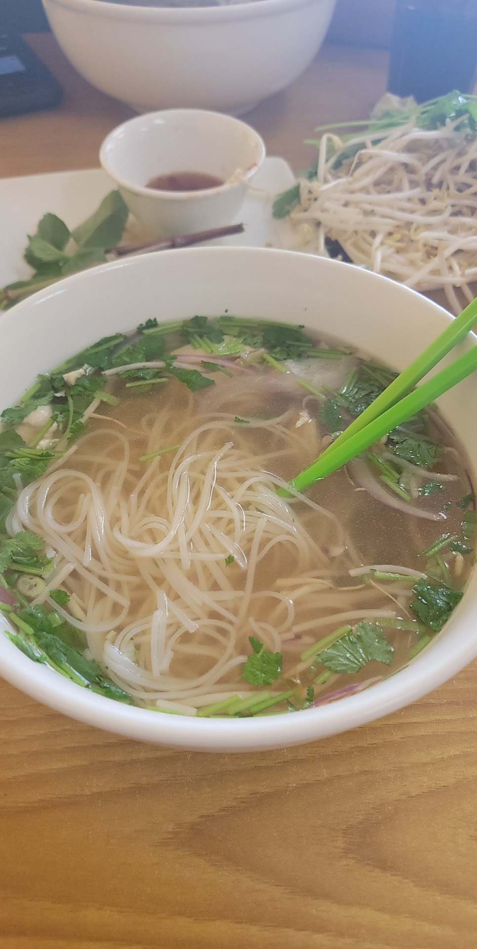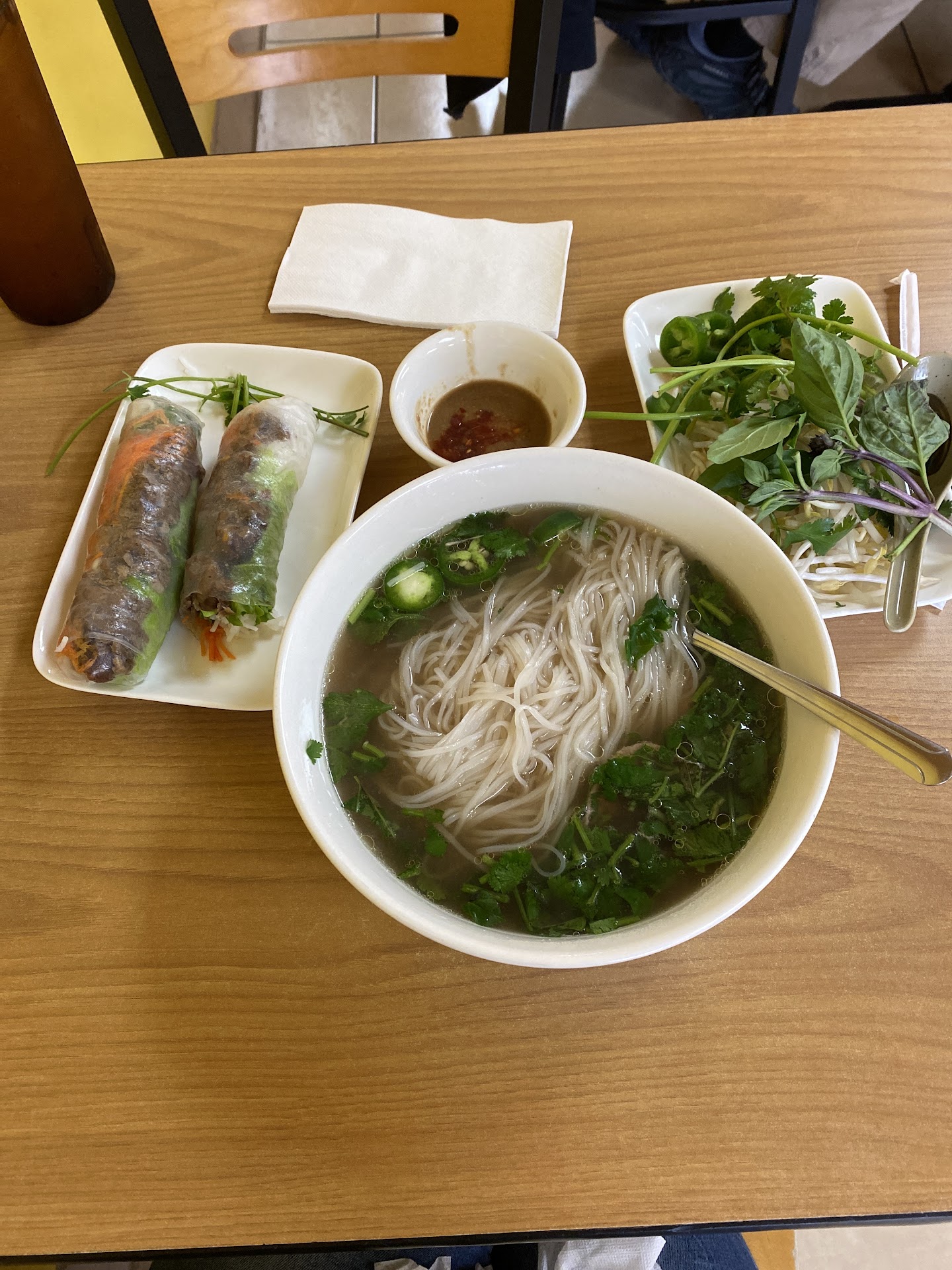 The atmosphere overall is Pleasant here. I enjoyed the P1 how special and some pork spring rolls. The sauce is okay, as far as peanut sauce goes. I think if they weigh with a garlic sauce it would probably turn out better for the spring rolls. Personal preference aside the broth here is very clean and I had also a half of a fried egg sandwich. The fried egg sandwich was actually very delicious and I highly recommend it. I'm going to come back and try some more things. The young lady that they mentioned served us, she was on her phone and excessive amount but she wasn't rude and overall was very attentive. The owner didn't seem to mind her on the phone so it shows that they have a very casual relationship. I didn't come at a busy time so I don't know how the services when they are busy. That being said, the service was attentive and quick. If you need anything all you had to do was look at her and she made eye contact immediately and came over. The restrooms are very clean which is a plus! The tables around you are also cleaned up pretty quickly so they keep what seems to be a very clean restaurant. Definitely a place with a casual vibe that delivers on food quality and price. I ordered a large Pho , an order of two spring rolls, fresh limeade, and a Vietnamese coffee to go. I only spent $18 and some change plus tip so overall under $25. I'm a big guy and I really wanted to try some things to see if I wanted to come back so I know that if I come back I may not have to spend that much depending on if my wife decides...