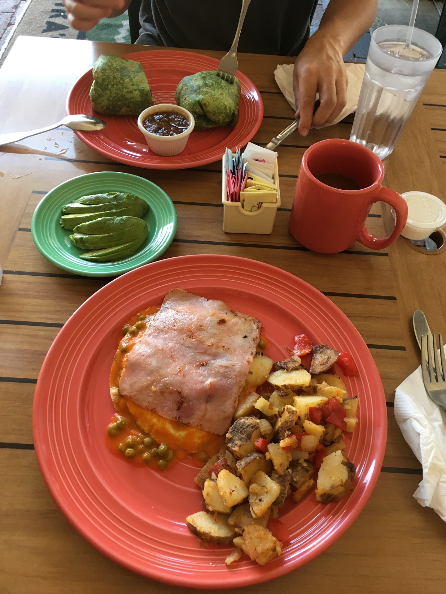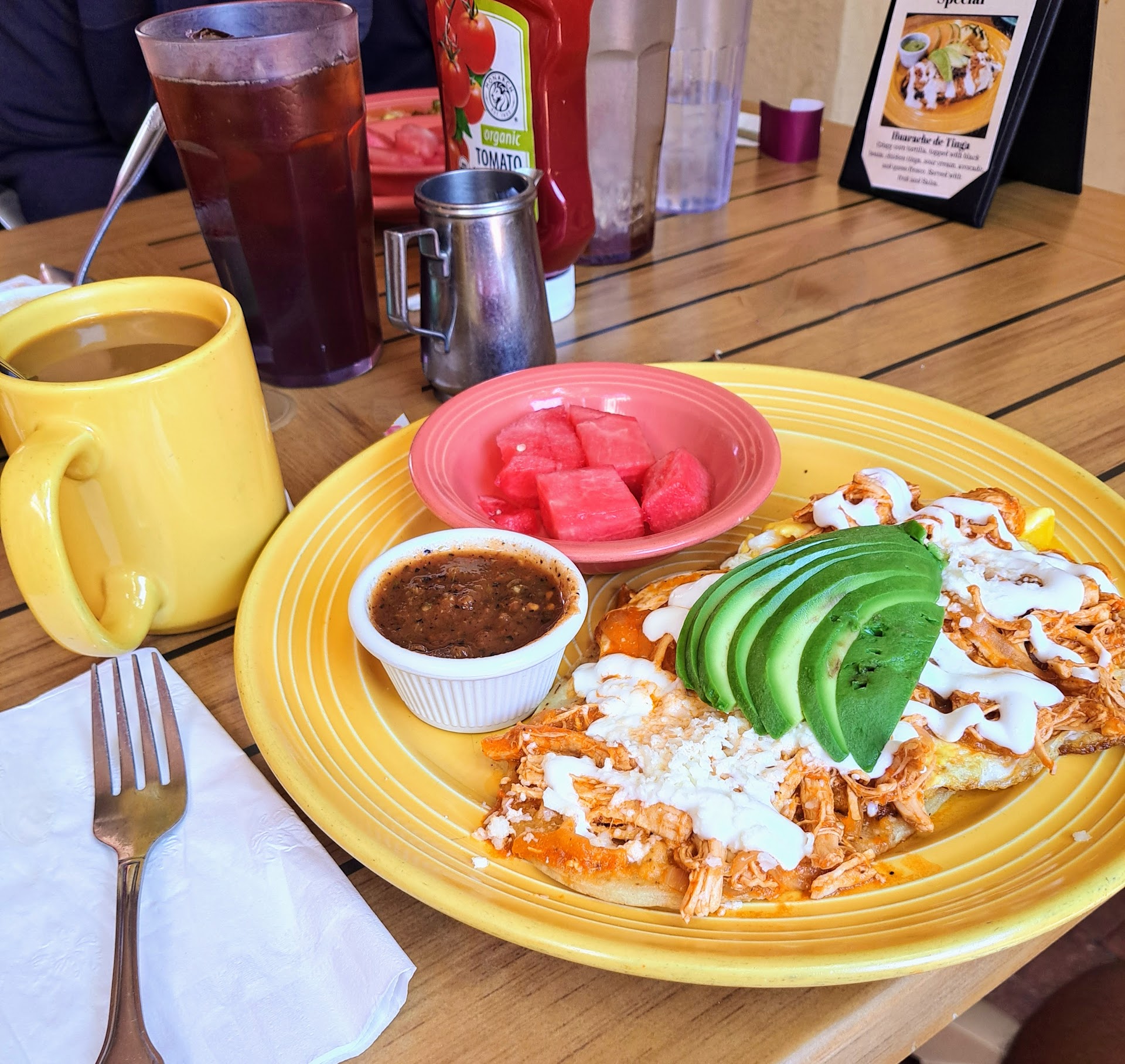 Food: Breakfast Mexican Panini - chorizo and egg sandwich toasted in a Panini press served with fruit. Delicious. Mexican breakfast scramble - great flavor, but the spinach released to much liquid and made the eggs a little soggy...now we know. California omelette - delicious, just add salt and pepper. Chips, salsa & guac - the chips were seasoned with a non-spicy red mix that was great. The guac was good , but needed a little more cilantro, onions and perhaps a jalapeno. The had a hint of cinnamon and wasn't overpowering.