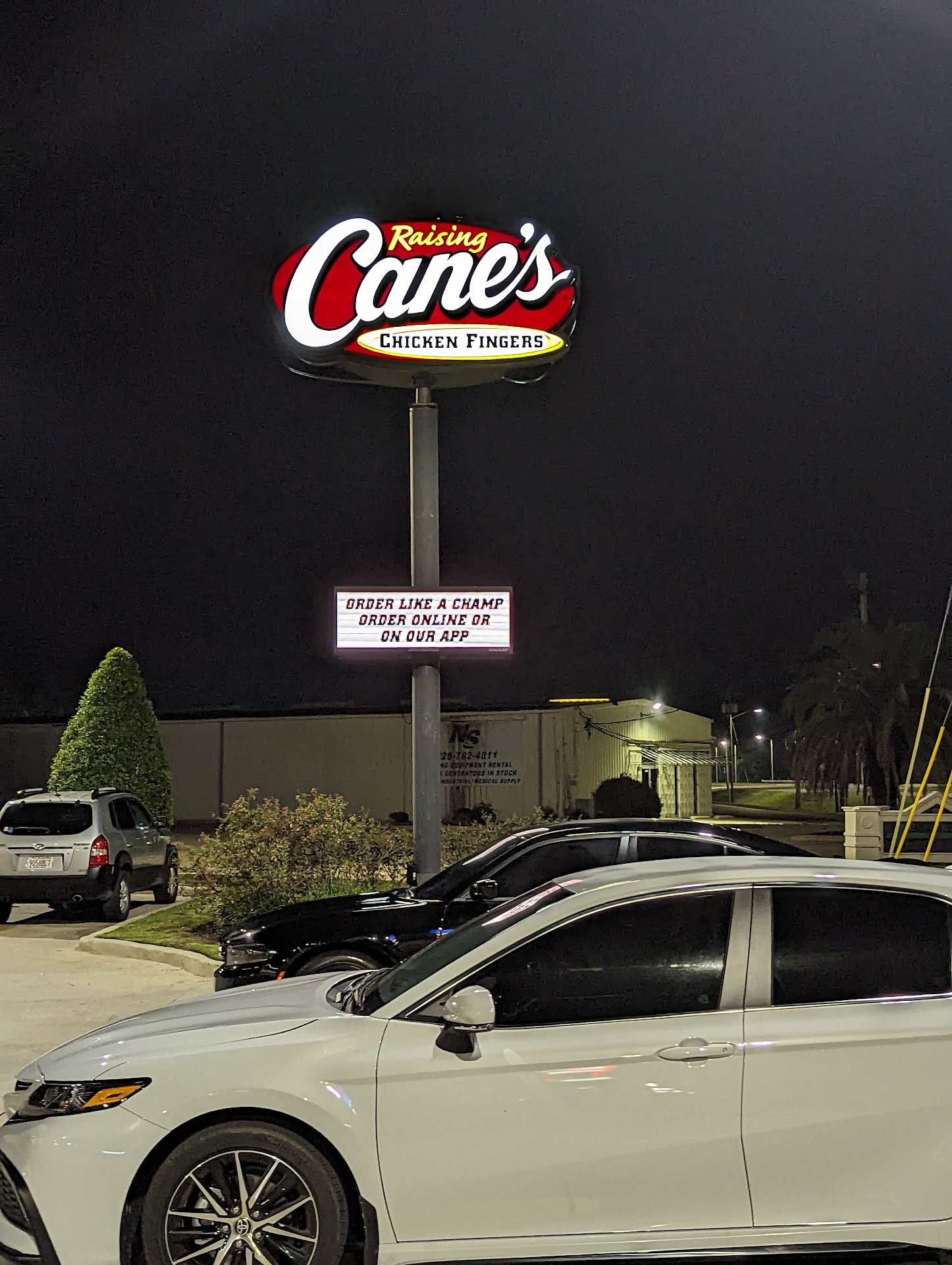 Read moreI am from Louisiana, and I have always loved raising canes! For, some reason this one store I have eaten at 3 times because my husbands mother and father live not far from it, and all three times I have tried eating here, for some reason I get very sick after EVERY TIME! I don't know what's the problem or what these people are doing w the food but something is making people very sick! My husbands mother and sister told me the first time that if wAs this canes, because they get sick every time they eat here too, and I seariously thought they were crazy and it had to be something else! But today a few hours ago was my third time trying it, and once Again, my stomach is killing me, and I feel like I'm going to throw up! I am now convinced that they were right and it has to be Something about this particular store! I will never eat here again, and wouldn't recommend anyone else...