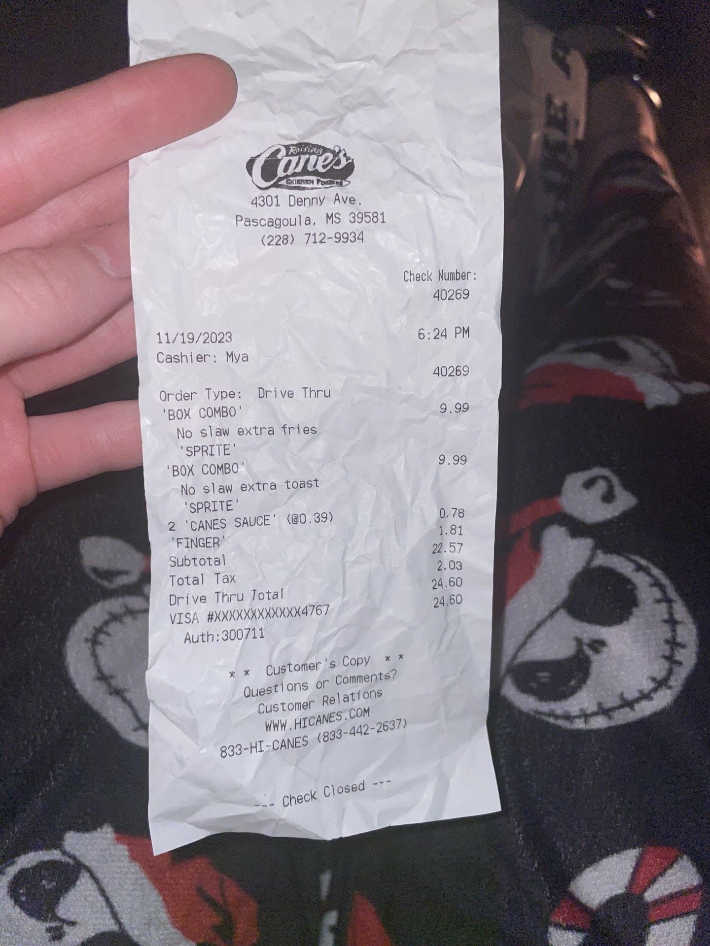 Read moreI usually don’t complain about canes and this one at that , but I went around 6:30 pm to get some food and I wasn’t very pleased. I asked for two combo boxes one with no slaw extra fries and one with no slaw extra toast and extra tender , and both with extra sauce.For some odd reason they put the extra tender in a separate smaller box I mean that’s no biggie just odd. They didn't give me extra fries nor extra sauce which you can see I did pay for. It’s only 39 cents but I definitely had some flavorless chicken. The line was so busy I didn’t even want to bother going in and asking for sauce. My cup was also completely filled with ice which I know isn’t supposed to be slap full. When I got to the window I was there forever and the young man told me the total and was not very talkative or polite giving us the food. For someone who is a past canes worker this Canes isn’t the best. The food was excellent as well the young lady taking orders but I’m not very happy because we all know Canes is expensive and I definitely didn’t get what I payed for. I know night shift usually tends to slack the most I just wish night shift worker would work harder and put up...