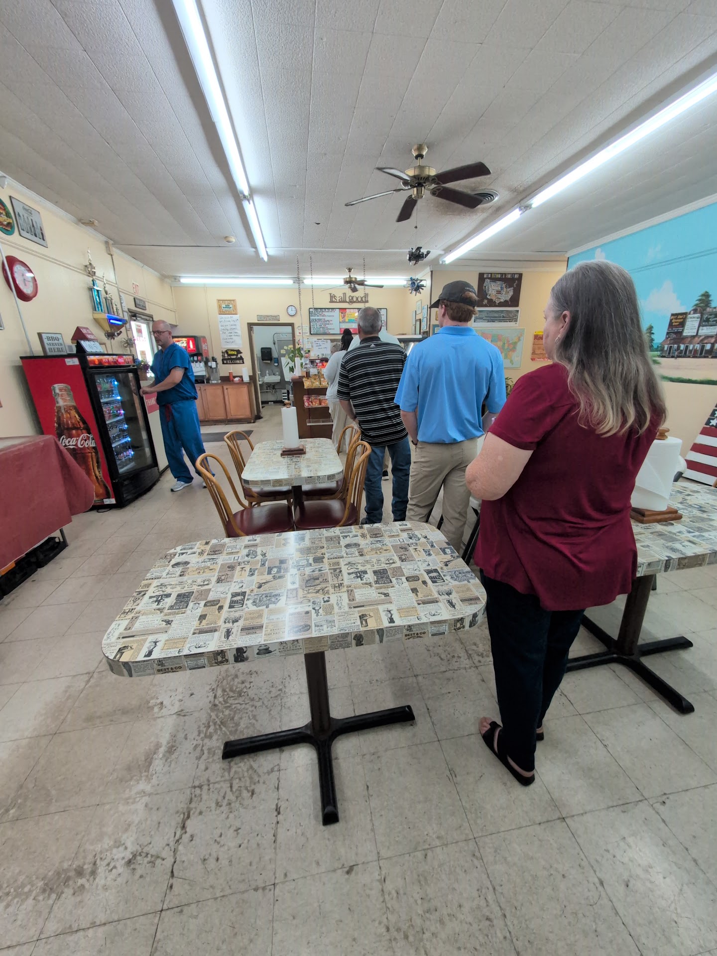 The name says it all. Hole in the wall BBQ joint cranking out good eats for lunch everyday. I've been several times in the past but had not come in awhile since the lunch club broke up. Partly because they are tucked away on the side of the building I often forget they're there and miss them driving by. Luckily I came to my senses and stopped by for lunch. It might've been the timing, coming at noon instead of 11am, but they were busiest I've ever experienced. Otherwise I would've called in that order and saved myself some time. They moved as quickly as their smoked BBQ would allow. I've had the pulled pork in the past, but went with the #4 combo with chicken, ribs and (jalapeno)sausage. With the two sides it was a lot of food. Everything was excellent. The sausage was appropriately spicy, and the ribs tender and smoky. Same with chicken, but I'm not sure how they get the skin so crisp. The sides are just as good as the BBQ. There was almost as much meat in my baked beans as beans. The baked potato salad is next level. I could eat a pint of that by itself. Remember to hit the condiments before you leave and slather everything in their sauce. I only got one togo cup and it...