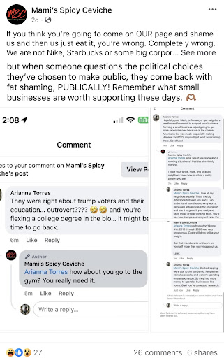 There is just something so ironic about serving Mexican cuisine and then flouting your support for politicians who demonize Mexican immigrants. This is a poorly run business whose owners love to use social media to pontificate about the teachings of Christ while regurgitating violent rhetoric about people who don't share their political beliefs. Mami's loves to make provocative generalizations on their page but will stoop to insulting their own patrons when their (poorly formulated) ideas are challenged. If you want ceviche with a side of condescension, this is it. Personally, I prefer one of the dozens of humble, locally owned businesses in my community that don't insult their own gente and who treat their clientele with respect...
