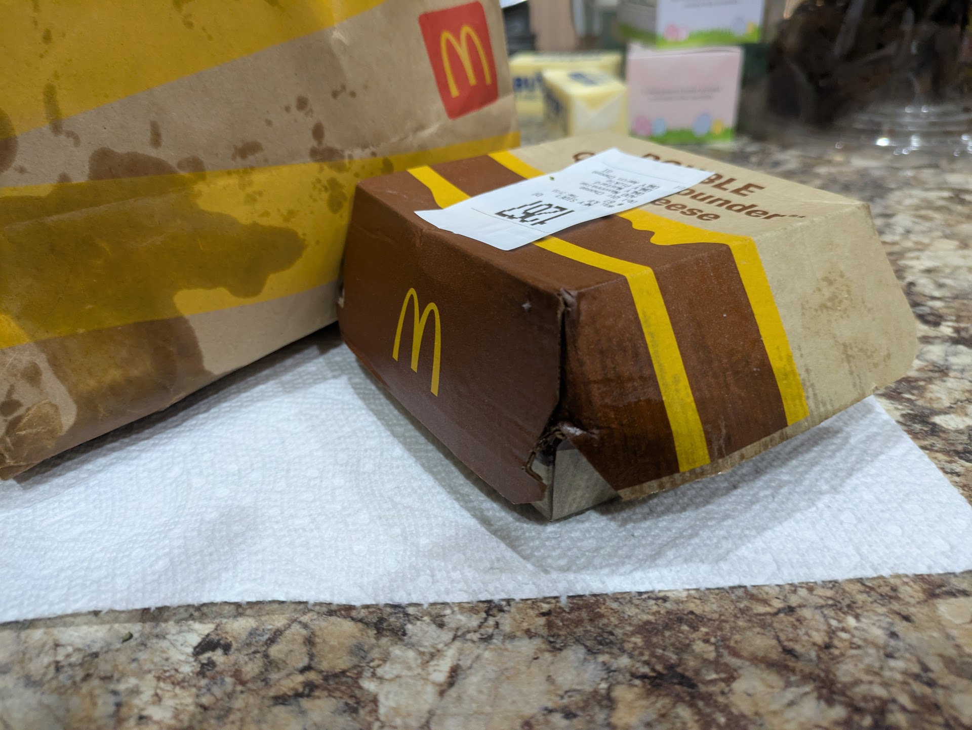 Tonight was really the last goddamn straw. Not only was my burger the exact opposite of what I asked for and repeated THREE TIMES, my husband's burger was a disgusting abomination that looked like they'd dipped the entire thing, bun and all, through the deep fryer and then thrown it into the box. The entire bun, box, bag, and every item below it in the bag were completely soaked in the grease pouring from this heart-attack-to-go. The pictures really can't do justice to how soaked everything was, including my hands and pants where I'd set the bag down before noticing after it seeped through onto my legs.