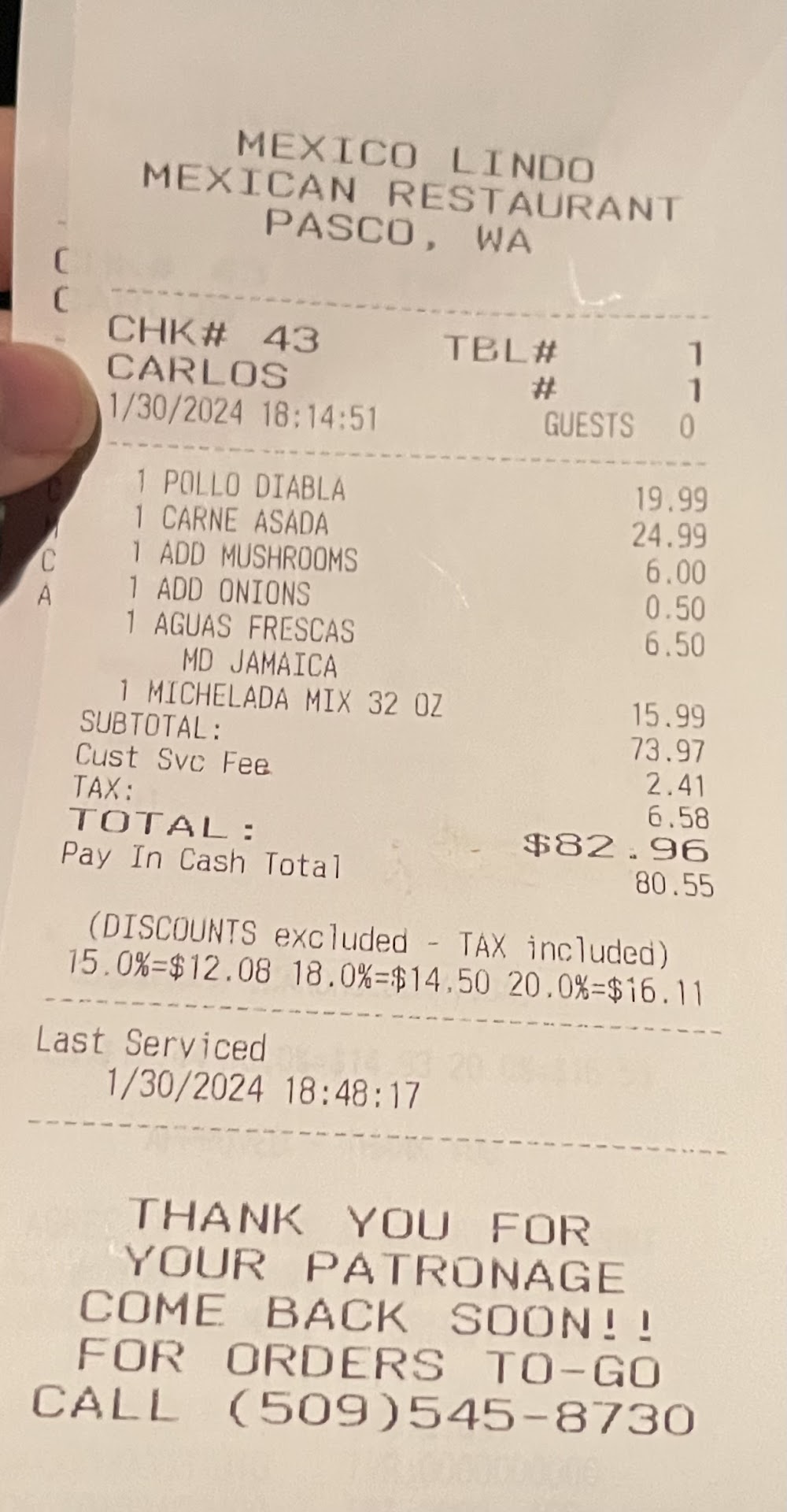 BEWARE CHECK YOUR CHARGES: Went to eat out with my fiancé for dinner for his birthday on a Tuesday and it wasn’t busy. The waiter took about 15 min after being seated to take our order. Since we were starving we ate all the salsa and most chips and asked for more salsa but 10 min later the waiter forgot so my fiancé had to take the empty container up to the counter to get more. 10 min after that the food came out. I had ordered pollo a la diabla and asked them to add mushrooms and onions but I was given camarones a la diabla. Mind you, I’m expecting so I can’t stand shrimp right now. As soon as he set the plate down in front of me he remembered and took it back to the kitchen so it took another 10 minutes to get my order right. My fiancé was basically done eating when I got my food so i didn’t eat much before asking for boxes and the check. When it came time to pay I saw that they charged me $6 for the added mushroom and 50 cents for the onion. I got about 6 slices of mushrooms (1-2 whole mushrooms) worth in my plate and I thought it was expensive for the additional added items being you can buy a box of mushrooms at the store for about $3-4. After examining the recipe more carefully I also saw that they already had a customer service fee incorporated into their receipt. I’m usually one to always leave a tip but after all the trouble/hassle we went through and the shock we had with the charges we decided not to tip. Recommend checking your receipts and being mindful of anything additional you add/prices. My pollo a la diabla was okay, not bad but I’ve had better. They just drenched the pollo with the salsa you eat with the chips. My fiancé liked his carne asada but he said the rice was too bland. He said the Michelda was really good though. See attached receipt for charges for 2 adults. Not sure if we would come...