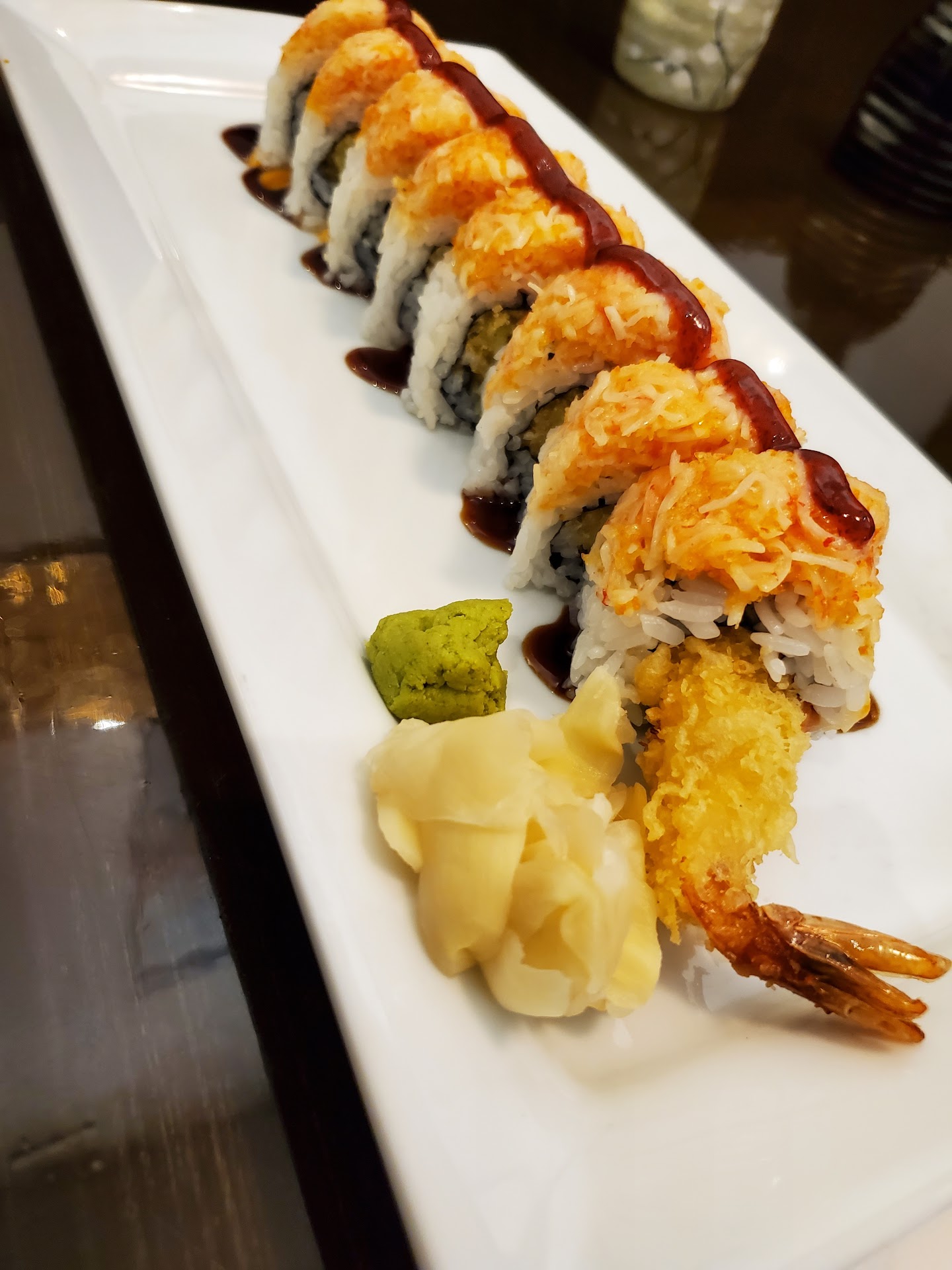This is the restaurant my family asks for all the time. The Angry Dragon has crab salad on top, is sweet & sour in flavor profile. The Pasco Roll has seared salmon on top, cream cheese, and jalapeno in the middle, this is our most favorite roll. The Lobster Deluxe is Really good too, lobster in the middle, and avocado. The Hawaii Roll had pineapple & the flavor was really good. Las Vegas Roll is a deep fried roll with cream cheese.The pink Lady Roll has the most tuna, spicy Tuna & shrimp inside, and tuna on top in a soy paper roll. If you aren't a fan of seaweed, u can ask to sub soy paper in your roll. The Calamari appetizer is super tender and has a great dipping sauce. The veggie tempura, spicy kani salad, fried jalapeno, peppered seared tuna, and the fried crab dumplings are yummy for appetizers. We love the pepper tuna appetizer with avocado & sauce. The fried avocado & tuna appetizer is very crunchy. The Thai iced tea & Ramunes are refreshing for drinks.The teriyaki chicken lunch or dinner comes with soup, salad with the most amazing dressing, and rice... my daughters favorite because she doesnt eat seafood. I liked the clear soup, was a brown color with mushroom in it.We have tried the steak & shrimp hibachi combo, medium with fried rice on the side. Good flavor. This is THE best place for Sushi. The employees are friendly & work hard to get your meals yo you. The ambiance cant be beat. Even the takeout meals are packeged beautifully & taste good...
