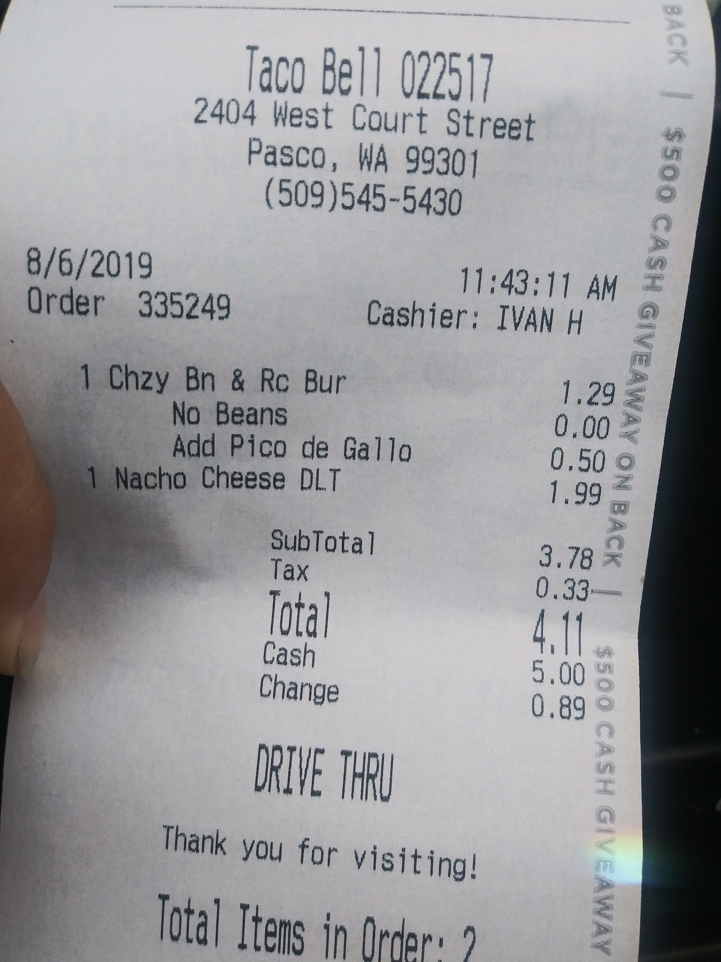 Read moreThis taco bell has higher prices than all the others in tri-cities I tried here twice and living on a budget this location is not affordable and it is inconvenient when you are use to the same price everytime for the same things except here. I won't be back fast food is skyrocketing in prices how can you work minimum wage and pay that for food fast food is becoming a luxury for the rich instead of lunch for the poor. First he kept telling me the screen was broken andgerang me up wrong 'Ivan' so then i had him read it back to me and he did have it wrong and he fixed it and the screen reflected my correct order and it was first time trying thw locos taco and it was a broken shell. Previously on my first visit it was a tall hispanic manager woman who told me if i didn't like the higher prices I could go to another location. So I decided to try again expecting prices a little higher but then there was also a fee for fresco style. Staff is rude here and high prices. Additionally I was rushed during my order so I didn't even get a drink leaving flustered and upset at the high price. Don't try fresco style anything here there is...