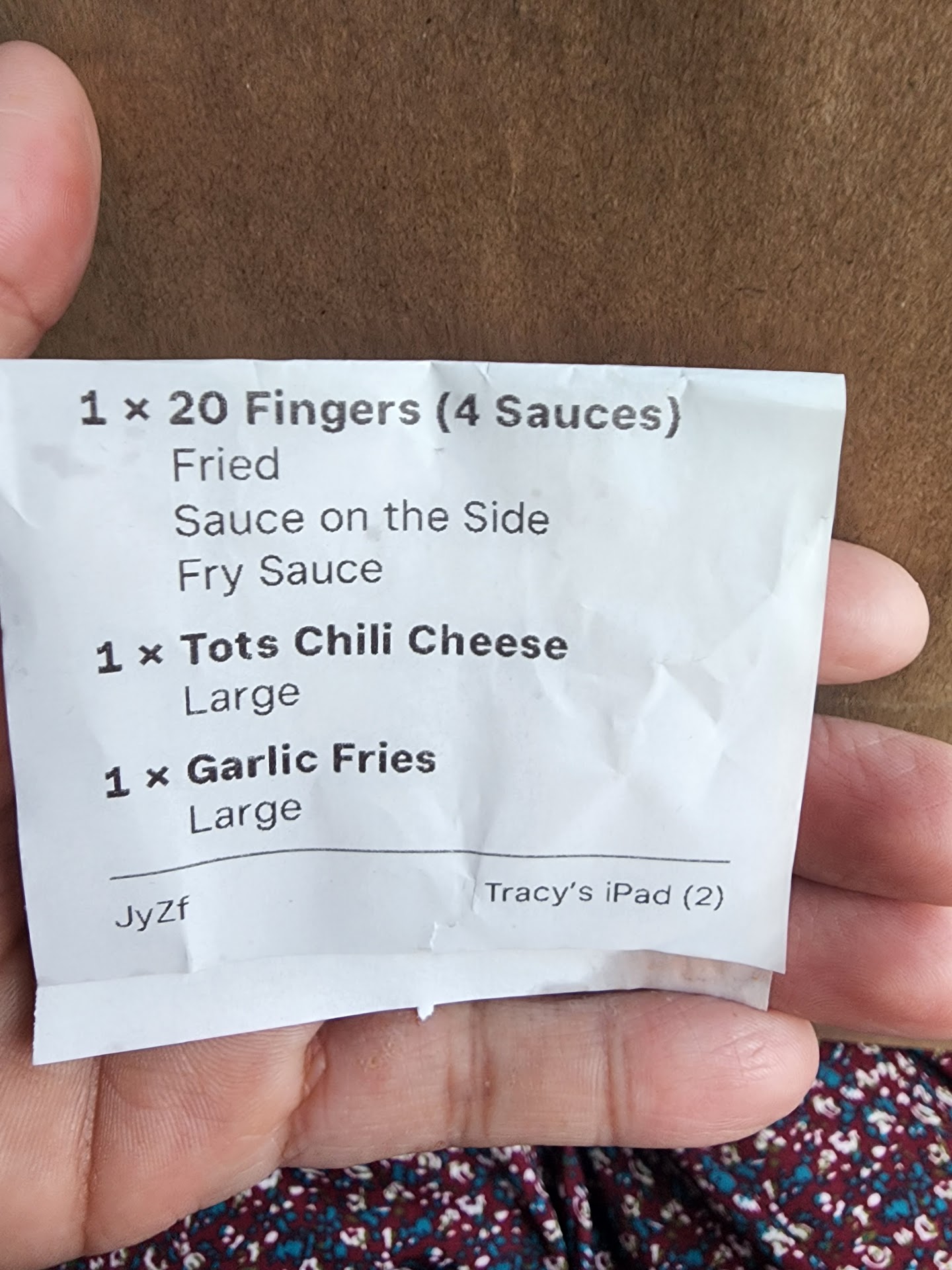I really wanted to like this place. The music was fun. The sayings on the wall were classic. The prices were high in my opinion but we were ready to try it anyway. So, we got the Shack pack (20 chicken fingers, 4 large drinks, 2 large sides) with sides of fries and tater tots. Normally, its $45.99 but because of the tater tots, we were charged another $3.