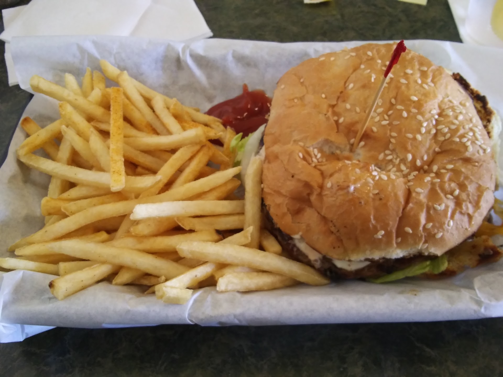 Read moreHad a cheeseburger and small fries. They must have a magic grill that gives the burger and the bun a deep, smoky flavor. The toasted bun has thousand island dressing and the burger is piled high with leaf lettuce, onion, and tomato. A dill pickle slice or two would be nice. Huge burger and the size of the small fries was more than I could finish. Have to say, this is a drippy burger and you'll need 6 or 7 napkins to keep clean. The fries are skinny, a little over-salted, but delicious. They offer variations on the basic burger and all look good on the menu. Had their fish and chips on a previous visit. Really good too. Battered pieces of fish deep fried served with the same fries and coleslaw. All portions were generous and priced well. Two complaints: parking lot sucks and they close early most days. But, for the best fast food burger in town,...