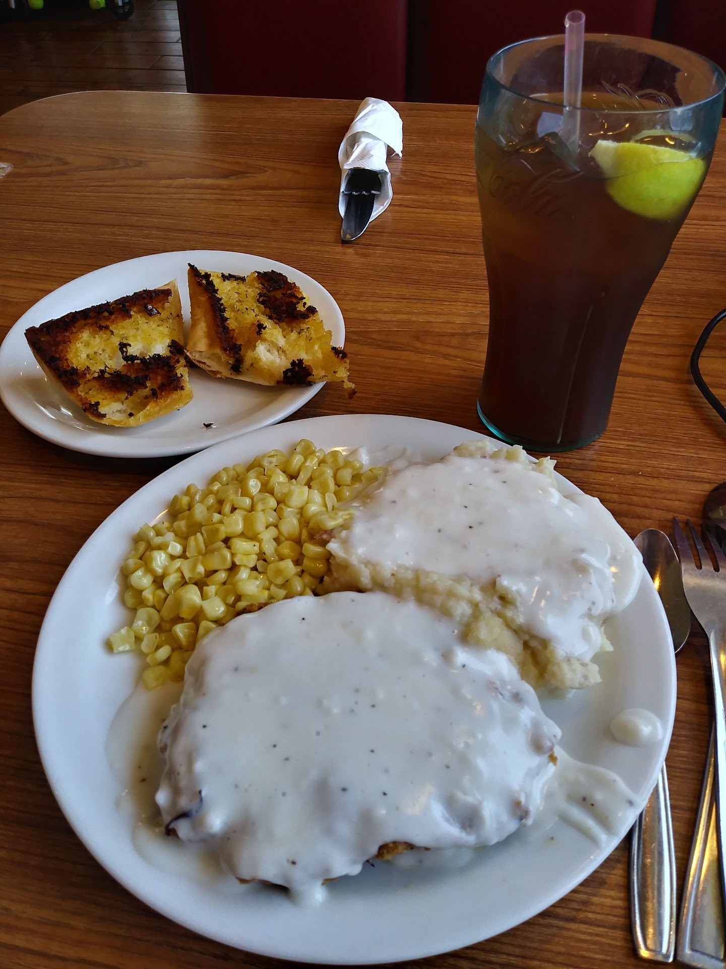 Read moreBy far, the worst meal I have had anywhere. The only reason that I didn't give it a one-star is because I can't prove that it was blatantly served that way. I ordered the chicken fried steak dinner with mashed potatoes and gravy and seasonal fruit (red grapes, strawberries, and banana slices) and a tea. The steaks were fine as one would expect from something coming out of a deep fat frier. The mashed potatoes were cold and tasted strange. I can't describe the taste, but they were gross, and I wouldn't recommend them. When I mentioned it to the waitress, she kindly asked if I'd like to have something different. I asked if I might have the corn instead. When it arrived, I tried it, and the taste was overshadowed by the extreme temperature. So I decided that I would move on to the fruit, I dumped it out on the plate and picked through it, selecting the strawberries and banana slices. The strawberries were strongly hard, and the banana slices were exceptional. I hope that it wasn't intentionally done, but if it were, then they are very sad. I would like to recommend McDonald's, Starbucks, Carl's Jr., Tortilla Town, Nate's Hot Chicken, Rustic Fire,...