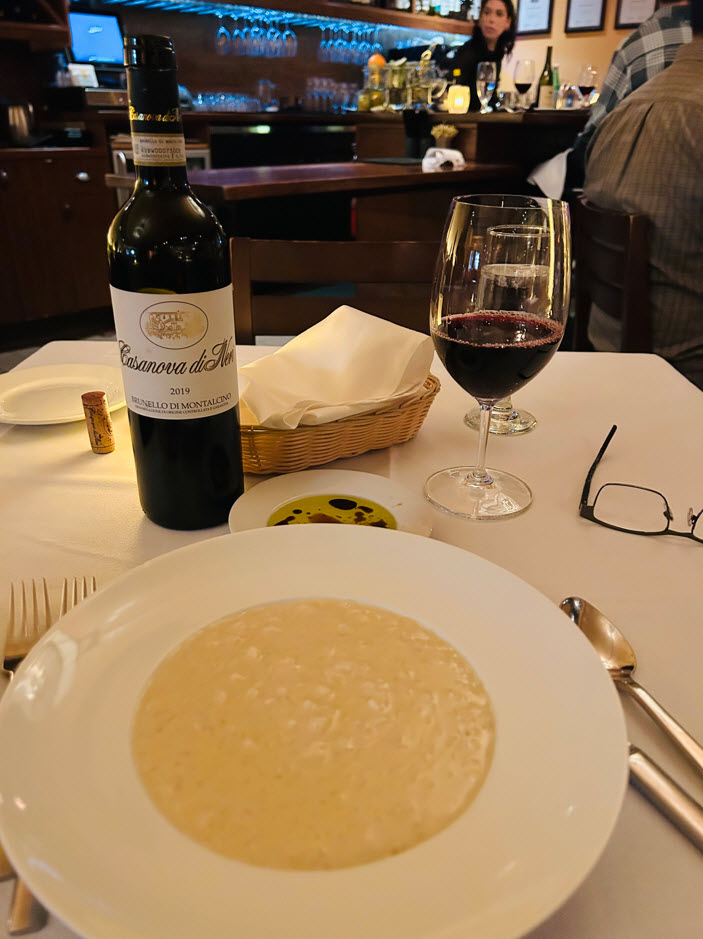 This restaurant in Paso Robles, California, is my wife’s favorite. I decided to see for myself if it lived up to the hype, and the wine, menu, and ambiance exceeded my expectations. From the beginning, I could tell this place was reserved for special events with mood lighting, elegant table settings, and light romantic music to create the perfect atmosphere for a special date or business dinner. I was eager to start because I’d only eaten 400 calories all day in anticipation of a luxurious dinner at my 7 PM dinner reservation. Knowing I’d need to walk off all those delicious calories, I parked a mile from the downtown city park area. My culinary journey began with the superb bottle of red wine called Casanova De Neri, Brunello Di Montalcino, from a famous wine estate in central Italy. I sought the 2017 vintage, but the 2019 proved excellent with this Italian meal. The seven magnificent vineyards of Casanova di Neri in Montalcino, Italy, provide the exceptional grapes for their award-winning wines. After opening the red bottle of wine to air out, I enjoyed it with my Italian bread, olive oil, and balsamic vinaigrette. I skipped the appetizer, ordering the Herb Parmesan Risotto main course, which tasted like a delightful blend of arborio rice, butter, onion, white wine, chicken broth, and Parmesan cheese. My second main course was the Lobster Tagliolini. The taste was reminiscent of delicate angel hair pasta, fresh green vegetables, a rich mushroom sauce, and succulent lobster chunks. To end the night in a “blissful food coma”, I indulged in four-cannoli Italian dessert. I thanked the owner (Carole MacDonald) and her staff for a fantastic Italian meal and evening, then enjoyed a post-dinner walk through the Paso city park to admire the holiday Christmas lights. We plan to return to this restaurant many times. Grazie...