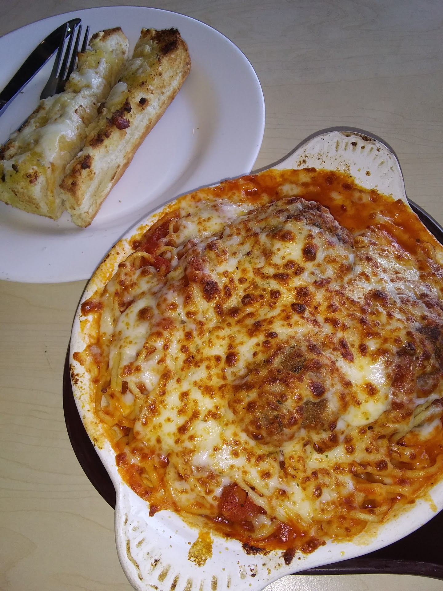 First time to this downtown location. Arrived at about 5pm. There were only four tables taken and by the time I left at 630, the place was about half full. Decided to try the pasta since I was not in the mood for pizza. You have to order and pay at the counter, they don't have waiters to take your order at the table. Decided on baked spaghetti with marinara sauce. I added meatballs to the dish for a $1 more. Pasta dishes come with a piece of cheesy garlic bread. I would rather have had a small side salad, but... Both locations offer a decent salad bar with lots of vegetable choices although no meats (ham, turkey, etc). They have a self-serve soda fountain along with iced tea. There are several big screen TVs showing a variety of sports. My dinner arrived and it was volcano hot! The spaghetti was covered with the marinara sauce, they added three large meatballs, and covered the whole dish with mozzarella cheese. They baked it until the cheese melted and turned golden brown. This is a large portion and is easily enough for two people. Tasted pretty good. The sauce had texture and was mildly spiced. The house-made meatballs were tender and tasty. The pasta was tender but not over cooked. What made the dish was the cheese melted on top. The cheesy garlic bread was meh. Still would rather have had a side salad. I will try other pasta dishes when I return. Other patrons ordered pizza and they looked pretty good. Did not notice much take out business. Maybe they get busier later in the evening. Limited street parking but plenty of spaces in the lot in back; adjacent to a public parking...