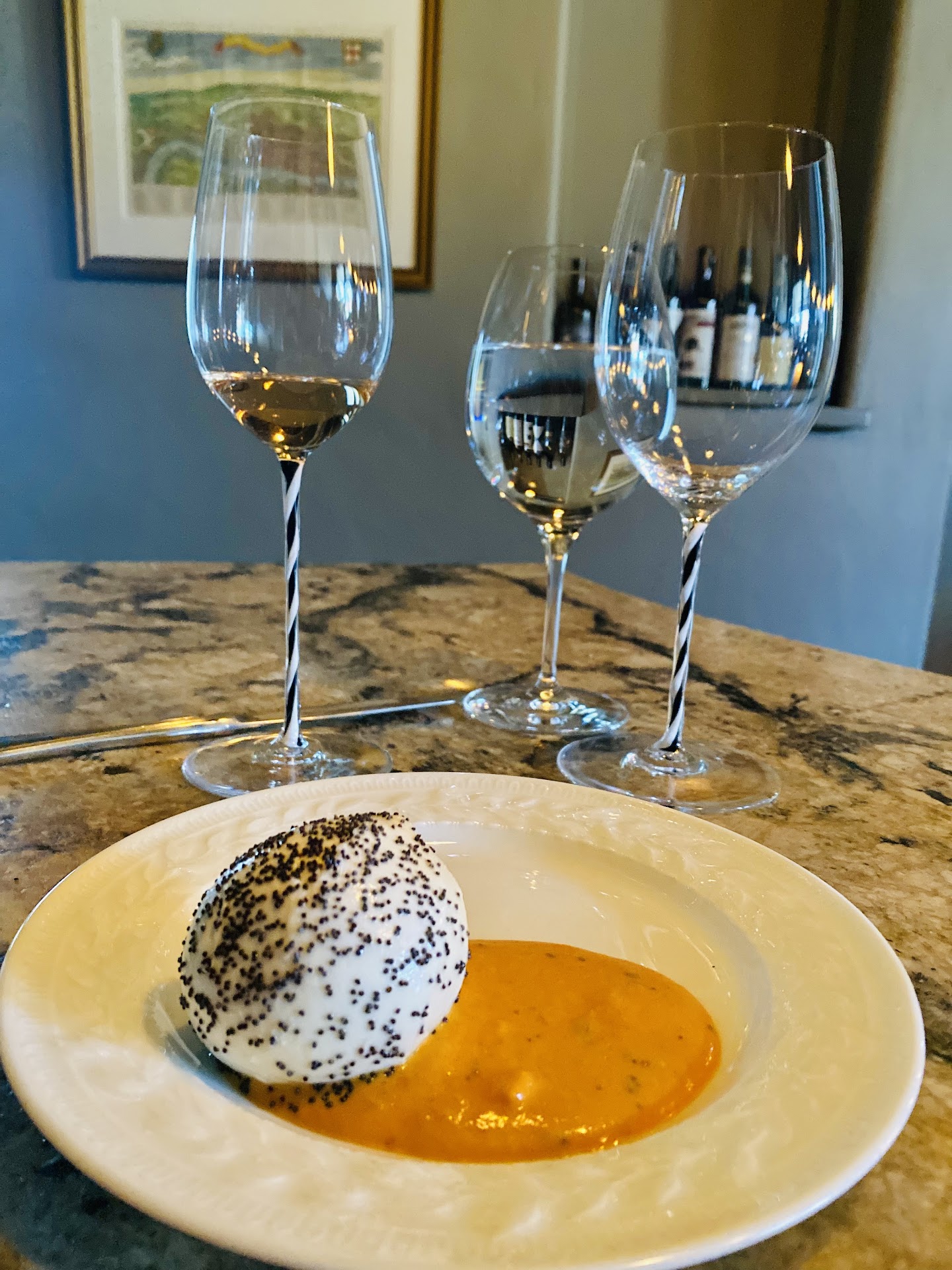 The setting is intimate and the restaurant itself is unassuming and tucked away (though a short walk from the park / town square in Paso Robles). The place comes to life with each guest arriving for dinner at 6p.m. and Ian’s welcoming and warm greetings. When everyone arrives and sits down at the counter, it feels like you are meeting new friends. There is great wine, delicious food, and good conversation, which is refreshing and much needed, especially nowadays when we spend so much time online. Ian tells stories and educates the guests on the wine and champagne, which is a fabulous experience for those who drink only socially and need to know what to pick from the wine list at a restaurant, as well as wine connoisseurs who are striving to attain Ian’s level of wine expertise.
