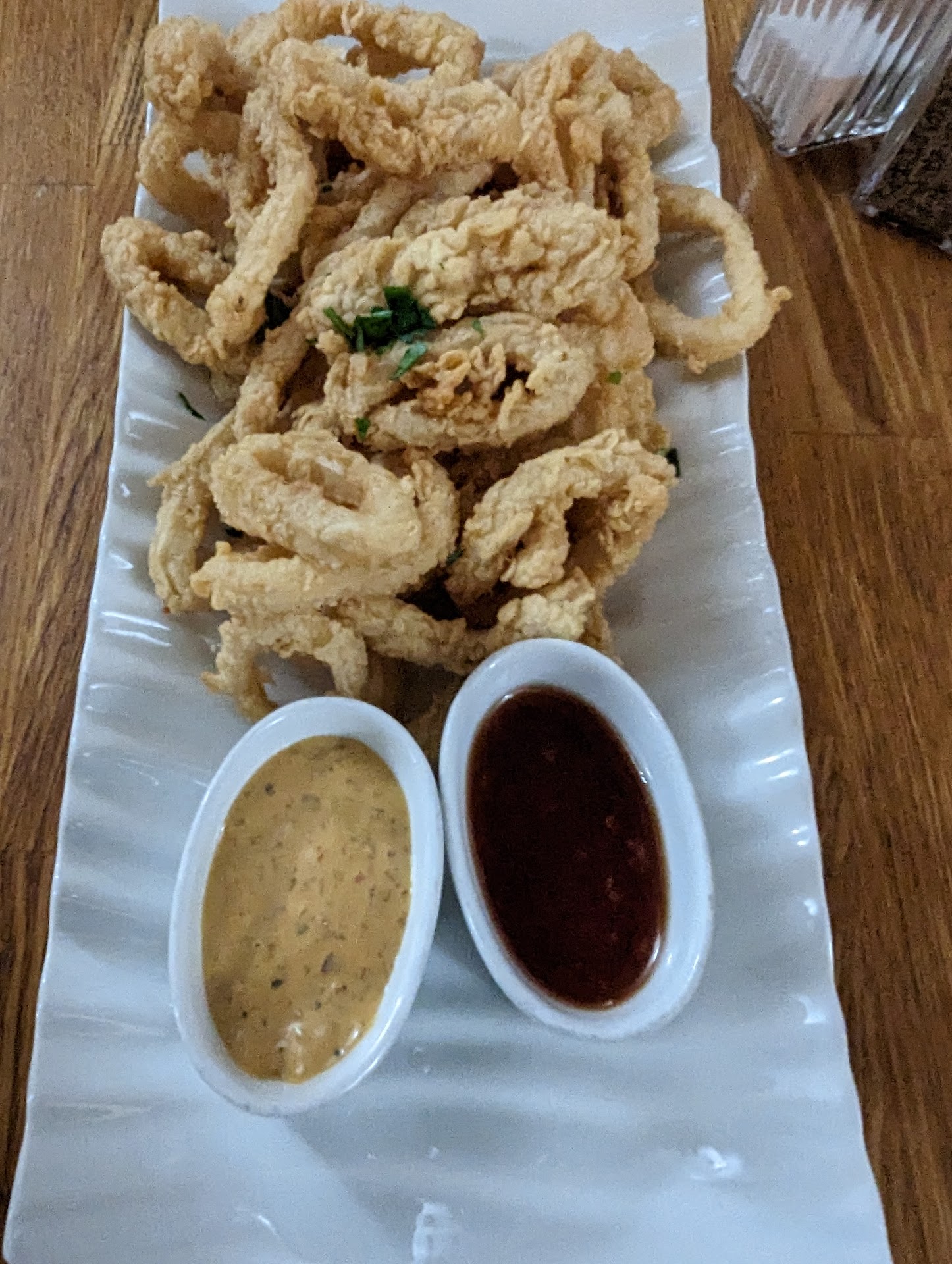 The food was delicious. We had the Chef's soup of the day which was Butternut squash with corn, Fried Calamari, Roasted Chicken Picatta, Ciopinno, and Pan Seared Salmon. The Butternut Squash soup was thick and very tasty. The Calamari came with Aioli and Sweet Thai Chili sauces. I thought it had a bit more batter than I am used to. The Chicken Picatta was very good. The chicken breast was cooked just right - juicy and tender. Ciopinno had a bit of spice to it. Not too spicy but if you are not used to spice, you may want to avoid it. Salmon was delicious as well. Our server, Jessica was very helpful...