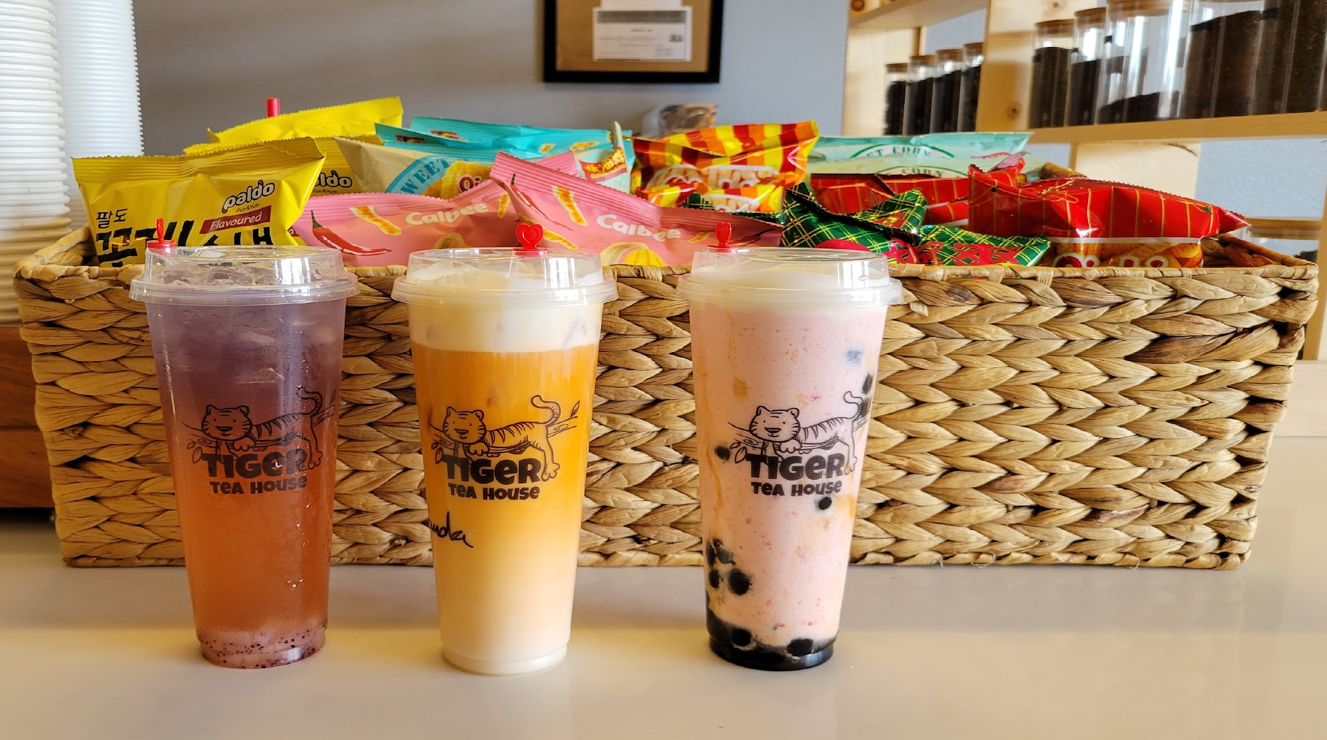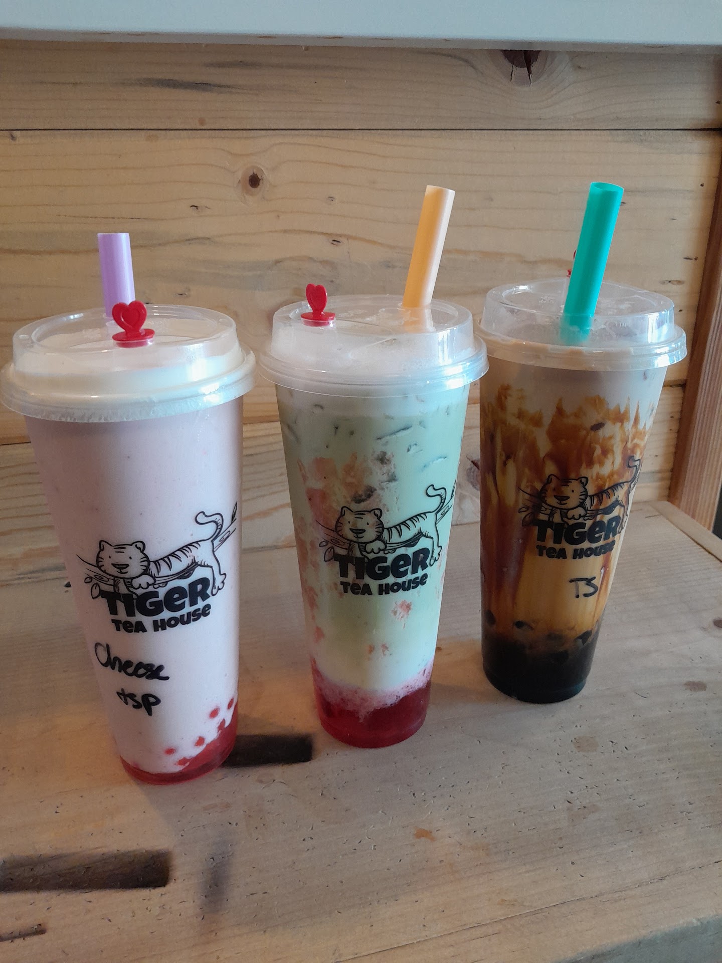 We love Tiger Tea House! Visited here more than a couple of times now and finally grabbed a punch card to keep track of the drinks we get. Cutest little shop with a quiet atmosphere and modern atmosphere. There are tables for dining in. My favorite drink is the Strawberry Matcha Milk with strawberry popping boba and the non-dairy powder. It is very delicious! We also thought the Tiger Stripes with regular tapioca boba was...