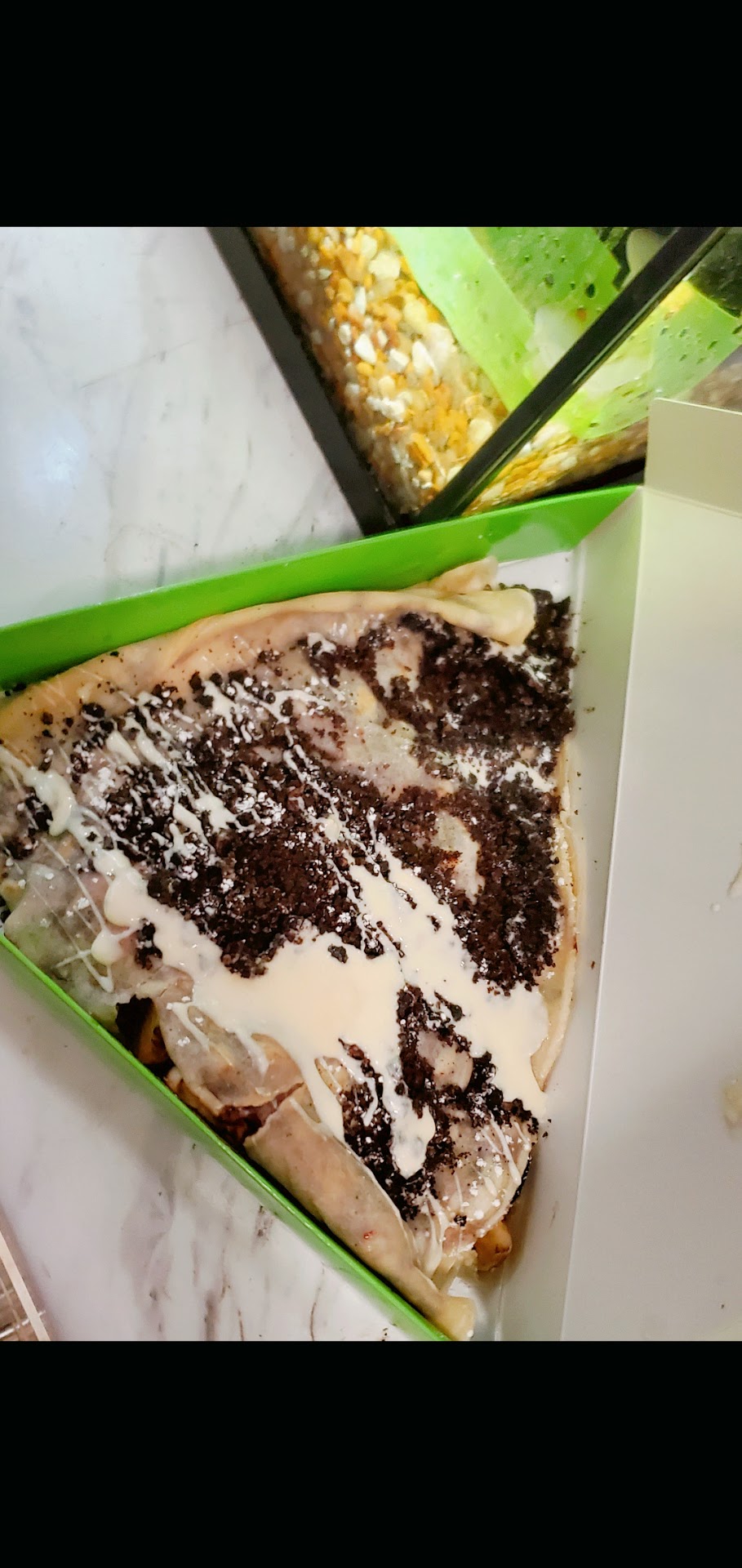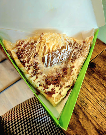 While I waited for my crepe to be made, I was treated to a sample of the viral Dubai chocolate. Admittedly, I've never tried it before, and wasn't sure what to expect. However, I can't even begin to express how amazing it was! It was served at room temp, which allowed me to appreciate and savor the different flavors and textural components. I enjoyed it so much I HAD to purchase one to go!