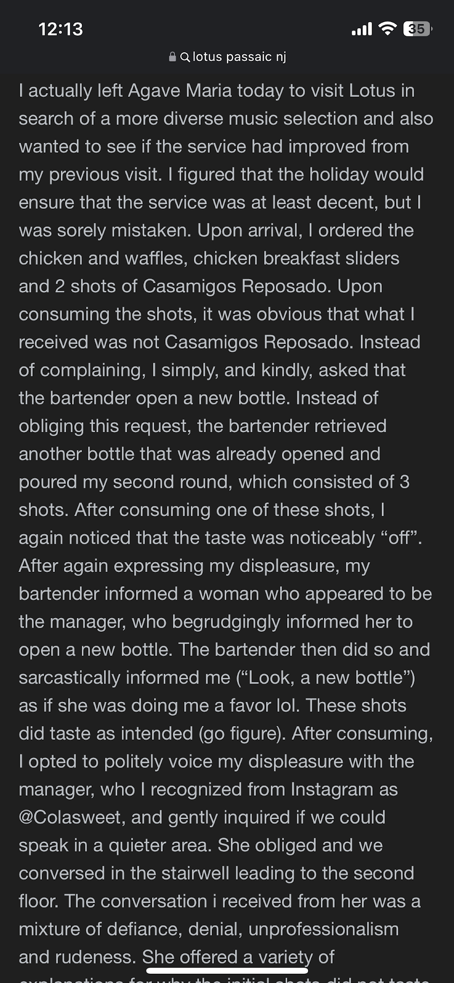 Edit: 5/28/24: I usually wouldn't engage in a back and forth on the Internet, but I would like to reply to your response to my review. I won't insult you and label you a liar (as I could), but your response is a lie in its entirety, and it is honestly shameful lol. I never called anyone (neither you nor the bartender) that term, as you claimed in your response. Your business practices are subpar and are an unfortunate reflection of who you are as a manager/operator and unfortunately, a person. All I asked was to have my shots poured from a fresh bottle. Instead of doing so, the bartender got another, already-opened bottle that had the same "odd" taste to it, these are facts. You and I both know that Don has replaced Casamigos as the "it" tequila right now and those bottles that my shots were poured from were either old, potentially tainted through unknown means (you even admitted the possibility), or likely reserved only for mixed drinks and customers simply can't tell the difference. The place was empty, which provided a perfect opportunity for your staff to ensure that my party was shown a reasonable amount of attention and courtesy. Instead, a simple request was ignored and handled dishonestly. This interaction likely would've never happened if I had my shots poured from a new bottle like I (politely) asked. I would've ignored the Eggos, the horrible sliders, the fact that I was informed hookah was available only to later find out that it wasn't and the 20% gratuity that was automatically applied to my bill despite the absolutely terrible service and overall experience. Your response to me prioritized you making up an entirely fictional scenario instead of addressing the valid claims related to the service like a true manager would do lol. This is no surprise, as all of the reviews that aren't favorable seem to have been given the same nasty responses. You do this because you are trying to ignore that this establishment has clear deficiencies. Furthermore, its comical that you spent time looking me up on the net in an attempt to defame me or invalidate my claims. It is also laughable that you would think I would waste my time trying to get "free booze". Truthfully, a claim like that is pitiful and isn't worth the time I spent typing that previous sentence. I also won't give you the satisfaction of making this a race thing because that's just lazy lol. This place describes itself as "upscale" on your website. I didn't give Lotus this label, you all did. The service simply does not match this self-applied label, this is yet another fact. Truthfully, I've wasted enough time addressing this and should've just been happy with only being charged for 2 of the shots, even though that should've been a given. I hope that God frees you from your anger, frustration and deceptive ways and that your business makes needed improvements to achieve (and maintain) the success that you desire. I also wish you a swift recovery from your foot injury. Be well.