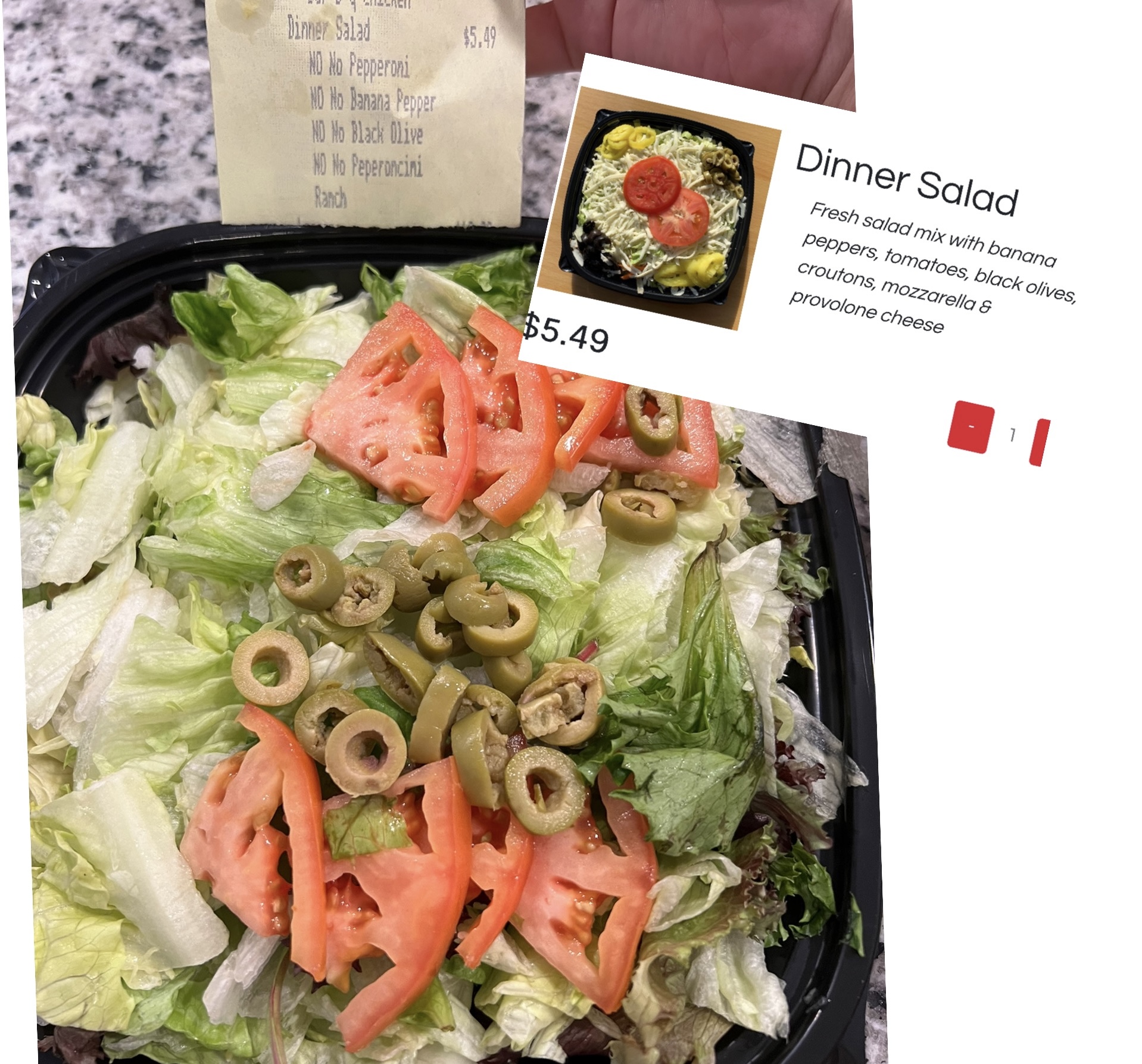 I ordered a Dinner Salad through their website. They added green olives despite it not being in the website description. They removed all of the cheese (the only reason I even order this salad).