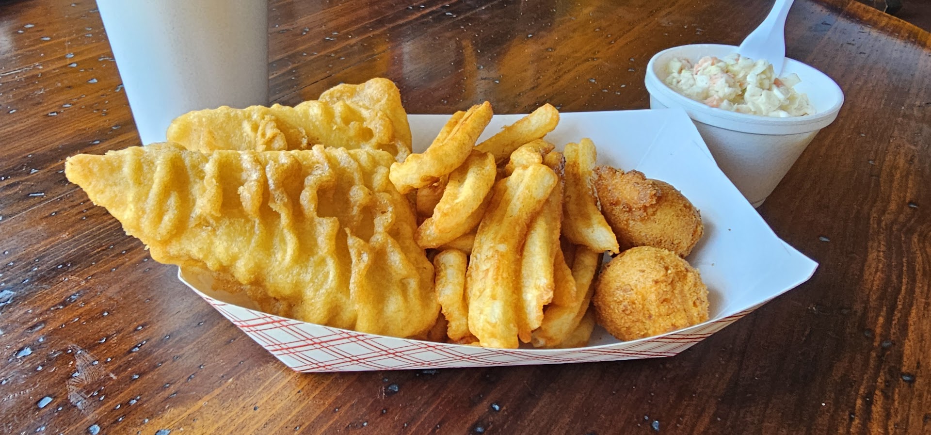 Original- After reading some reviews I decided to try Rusty's out for lunch on my way home from work. Things to know upfront include parking is on the other side of the building you see from 310 and so is the entrance, you order and pay at the counter when you walk in, you leave your tray and baskets on the table when you're done and they clean up. The service was outstanding and the employees seemed light hearted and happy to be there. I ordered the fish and chips ,since that what seems to be popular, and a side of cole slaw. The food came out timely although it was early and I was the only one there. It's cooked when you order so it is definitely fresh but I could see it taking time if they were busy. The fish was a little lackluster in my opinion as It seemed dry and lacking flavor but the batter was nice and crispy. The fries were definitely different than most and crispy. They were seasoned with something similar to rallys but not too salty or spicy. The hush puppies were crispy and similar to captain D's although much smaller. The coleslaw was fresh, cold, and had an excellent flavor and did not have fennel. The drink was a little flat but I'm sure I got the line pop since I was probably the first customer. All in all I wouldn't turn down going to Rusty's again and would like to try other items...