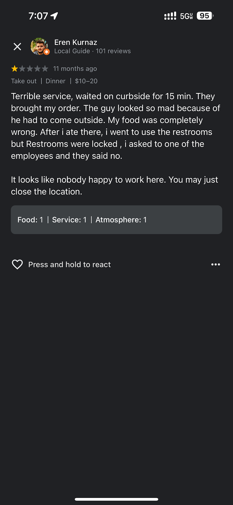 Read moreThis morning I purchased a coffee at McDonald's located at the intersection of Broadway & Madison Ave. While waiting for my order I asked if my wife could use the bathroom. With a laugh, the cashier said I had to spend $5.35 in order to use the restroom. I asked to speak to the manager because I buy at this McDonald's every morning and I know there was no such thing of spending $5.35 to use the restroom. When I spoke to the manager, very rudely she said my wife could not use the restroom unless I spent more money. There was a spanish cleaning lady there and I explained to her what I was told by the other employees and said she would open the door for my wife. When the lady tried to buzz my wife in, she was yelled and threatened by the other employee not to let her use the bathroom. Being embarrassed and upset about this I called Paterson Police to make a complaint. Unit 103 came and took my info and said they would pass it on to their supervisor. The way we was treated, I believe this was a racial issue beings my wife is white and I am hispanic. Thank You for your...