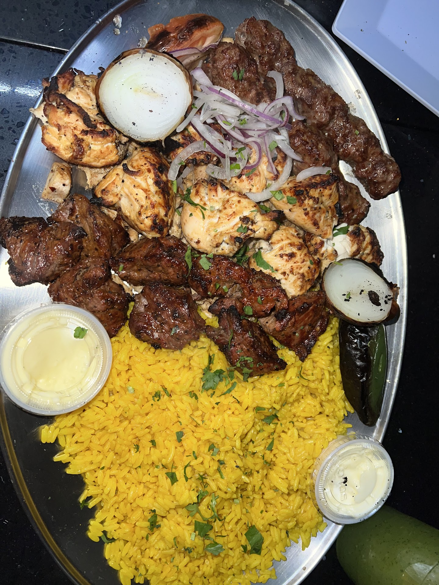 Disappointed by how we were served. Terrible customer service, we dined in as a family and were charged a service fee and their service was trash, we ordered the mix grill and they only gave 2 small side garlic sauce. They gave us disposable utensils to put our food, which restaurant does that. I had to ask for another spoon, that's when they gave me a proper serving spoon. I also asked for hot sauce to add for some taste and they charged me for it. Make sure when you pay the bill you look at it twice they add items you didn't even have. I was charged for extra garlic sauce and hot sauce which is total nonsense. If someone is dining in don't be cheap with the sauces and be good at your customer service.